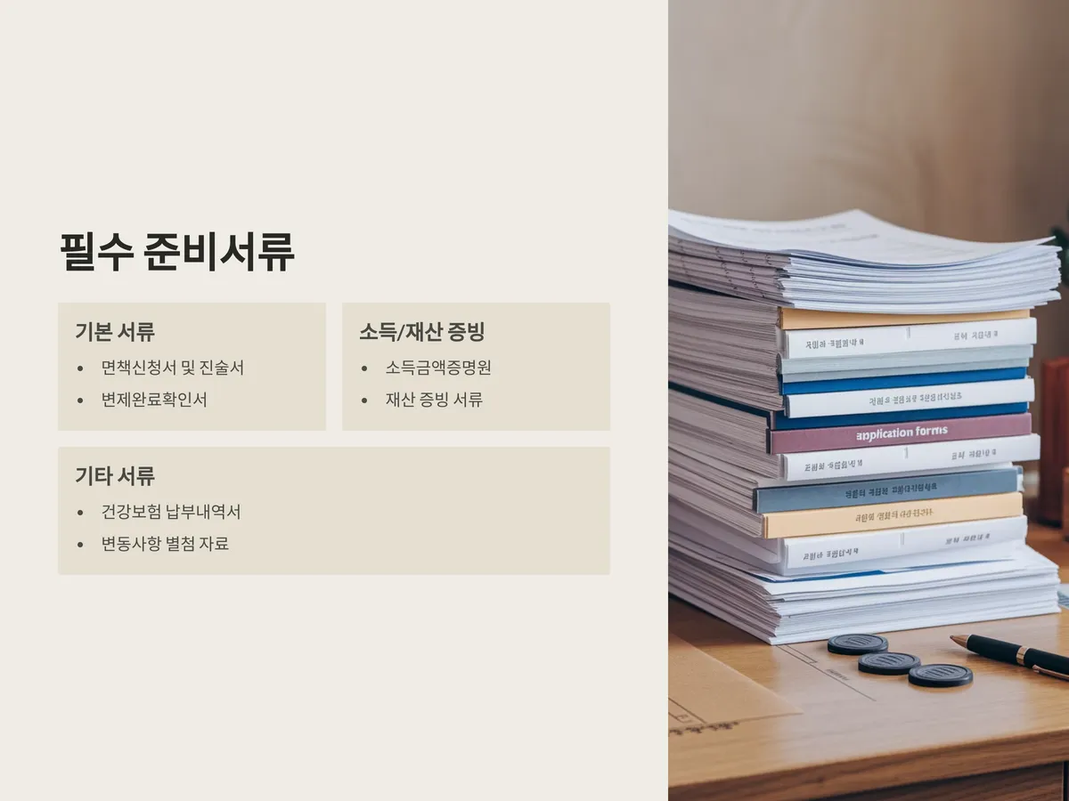 서류 준비는 면책 성공률을 좌우하는 가장 중요한 단계 중 하나입니다. 제출 서류는 다음과 같습니다: