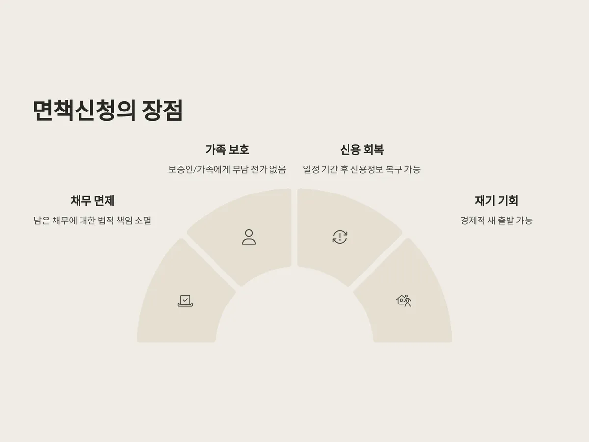 면책신청의 가장 큰 장점은 남은 채무에 대한 법적인 책임이 사라진다는 점입니다. 특히 보증인이나 가족에게 법적 부담을 전가하지 않으면서도 자신의 신용을 다시 세울 수 있는 기회가 되며, 일정 기간 이후에는 신용정보도 복구 가능합니다.