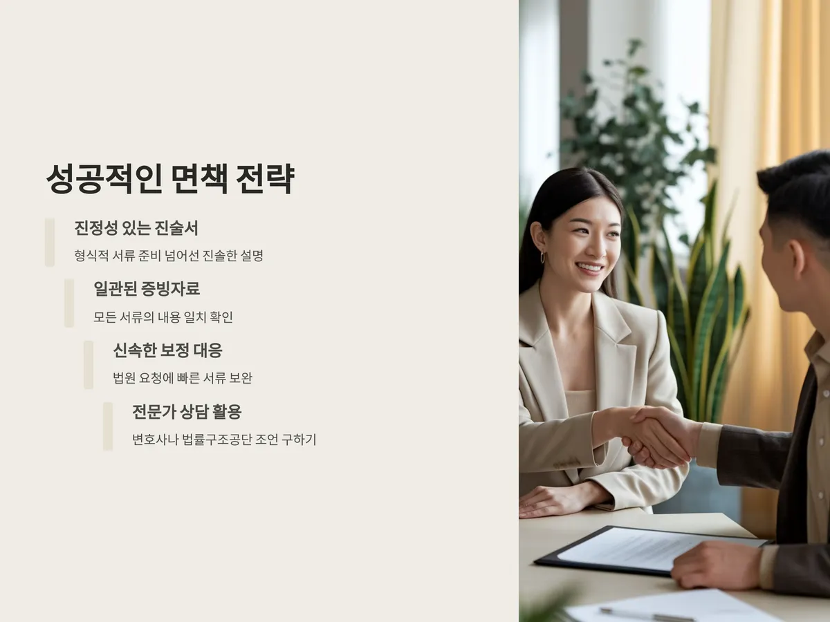 성공적인 면책신청을 위해서는 단순히 형식적인 서류 준비에 그치지 않고, 신청자의 상황을 진정성 있게 설명하는 진술서와 각종 증빙자료의 일관성이 가장 중요합니다. 특히 법원의 심사 트렌드를 면밀히 파악하고, 보정 명령에 신속하게 대응하는 것이 승인율을 높이는 핵심입니다.