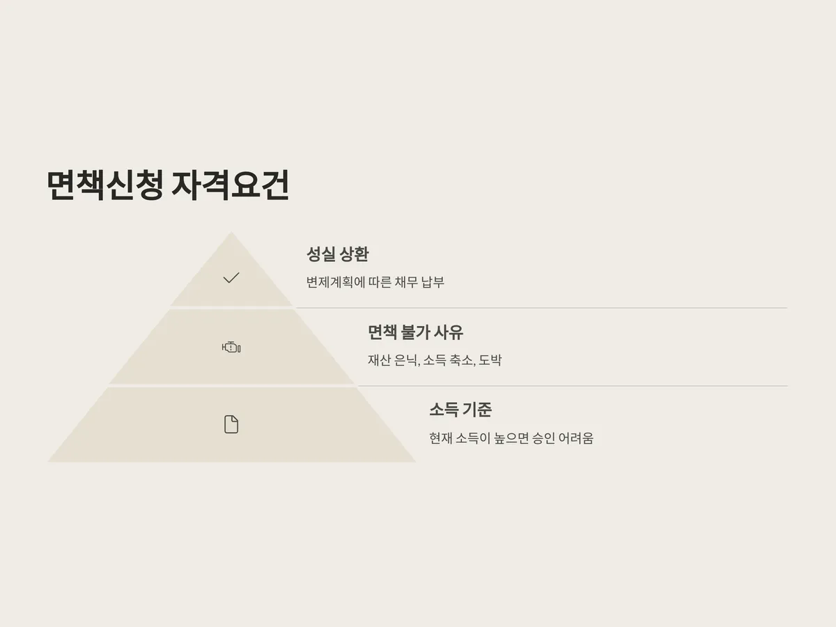 이 외에도 신청자의 현재 소득이 일정 기준 이상일 경우, 남은 채무의 일부라도 상환이 가능하다고 판단되어 면책 승인이 거부될 수 있습니다. 반대로, 실직이나 중대 질병 등 불가피한 상황으로 인해 상환이 불가해진 경우라면 해당 사유를 입증할 수 있어야 합니다.