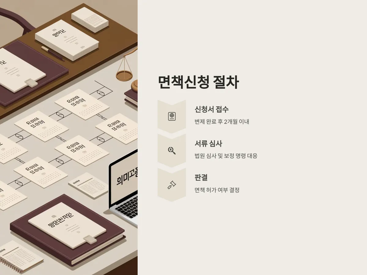 면책신청은 변제완료 후 2개월 이내에 신청해야 하며, 이 기간을 넘기면 법적으로 기회를 상실할 수 있어 기한 엄수가 매우 중요합니다. 신청 시 제출해야 하는 서류에는 변제 완료확인서, 소득 증빙자료, 재산 목록 등이 포함되며, 신중한 작성이 필요합니다.