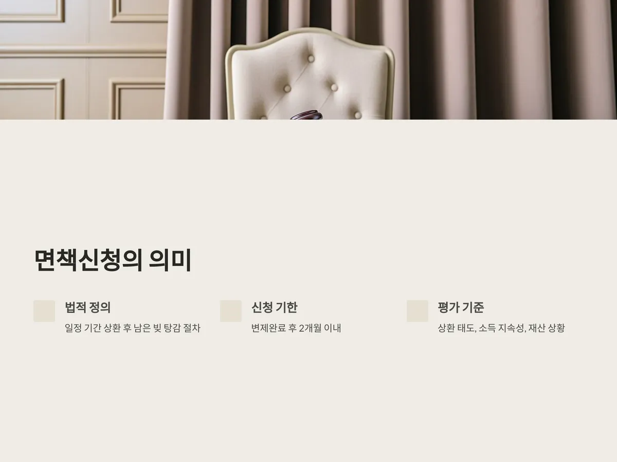 면책은 단순한 채무 면제가 아닌 ‘재기의 기회’라는 성격이 강하기 때문에 법원은 신청자의 상환 태도, 소득 지속 가능성, 재산 상황 등을 종합적으로 평가합니다. 특히 최근 강화된 심사 기준에서는 진정성 있는 신청이 아니면 기각될 확률이 높아졌습니다.