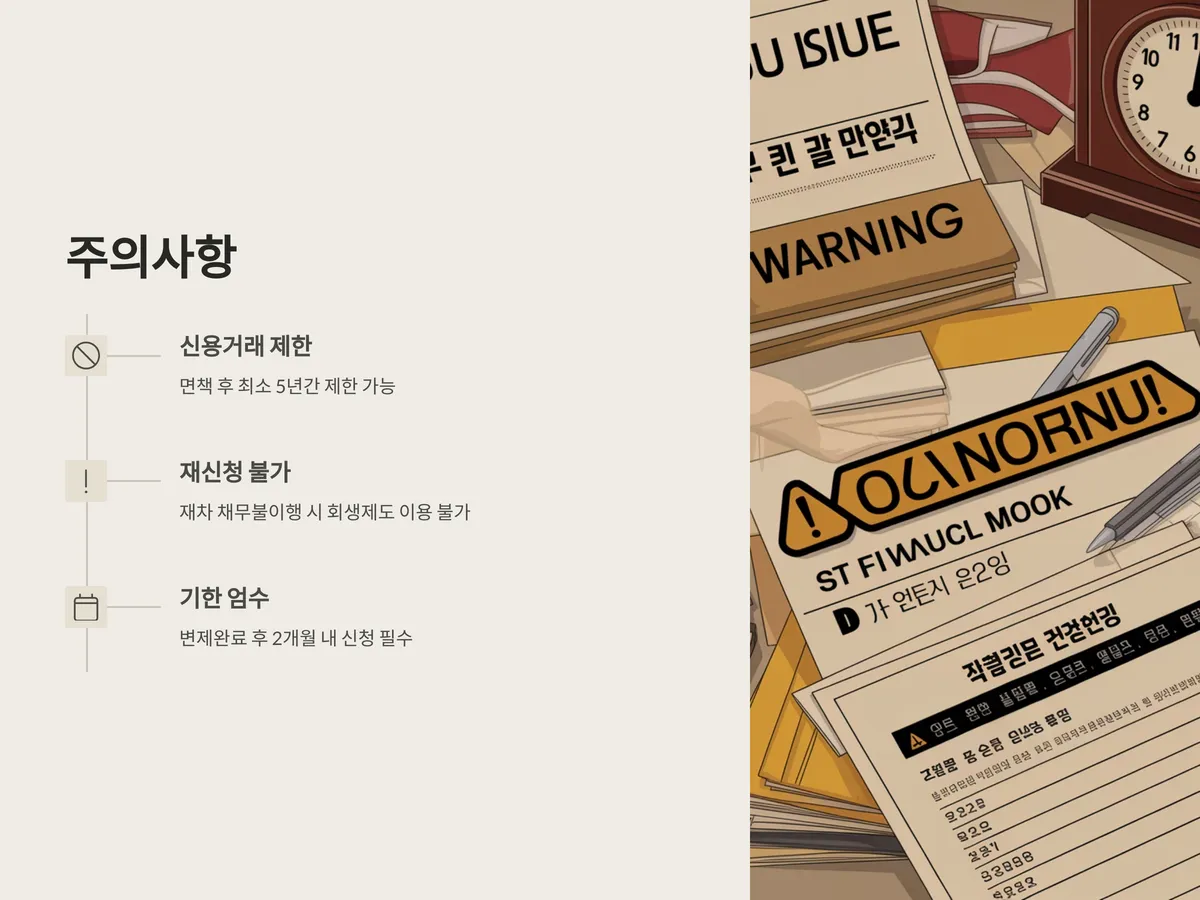 다만, 주의할 점은 면책 이후 최소 5년 동안은 추가적인 신용거래가 제한될 수 있다는 사실입니다. 또, 향후 다시 채무불이행 상태가 되면 더 이상 회생 제도를 이용할 수 없게 되어 경제적으로 더 큰 어려움에 처할 수 있으므로 책임 있는 금융생활이 요구됩니다.