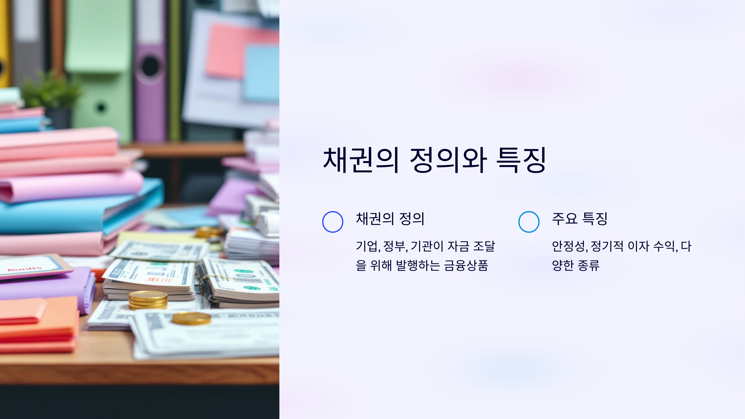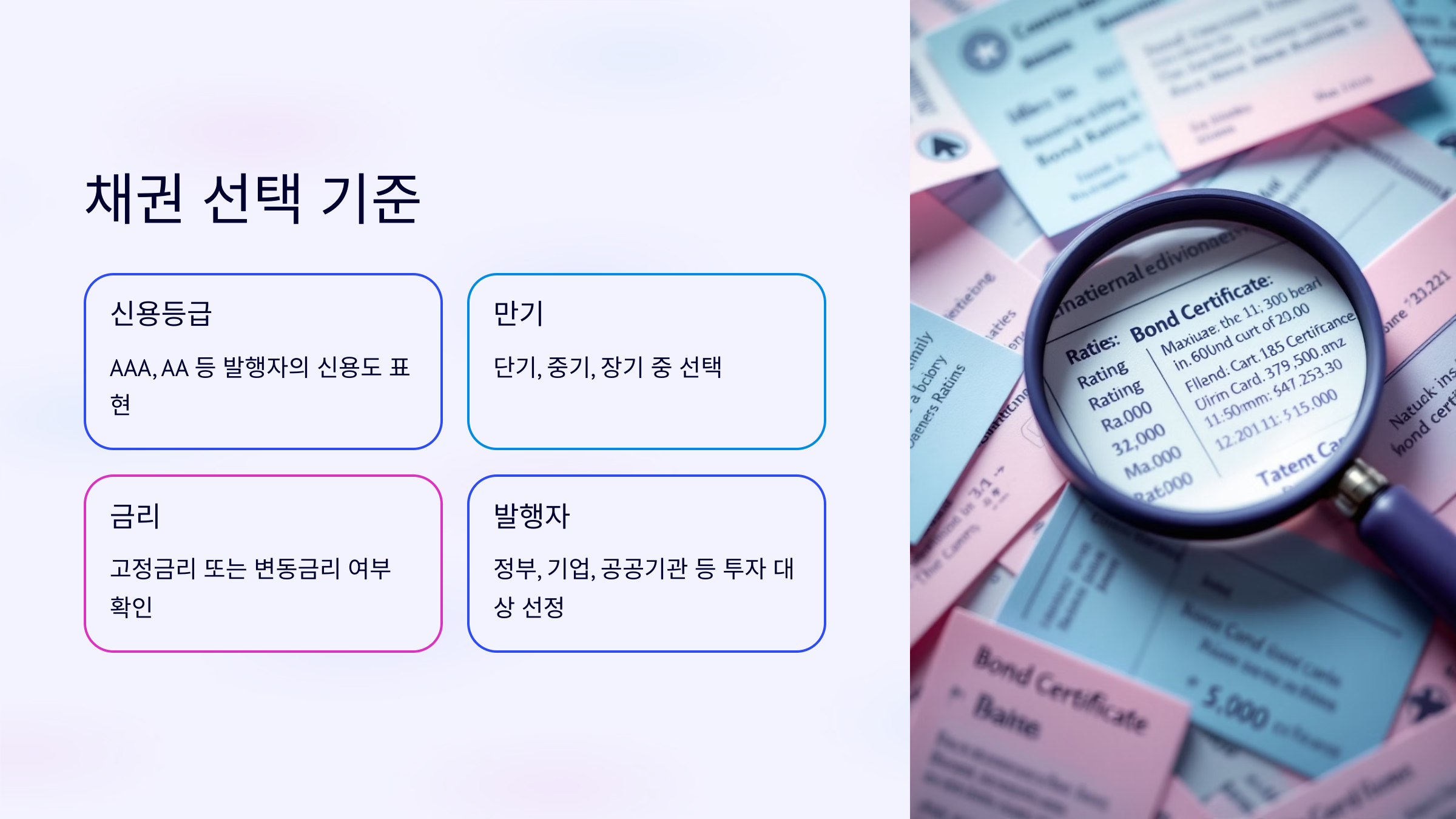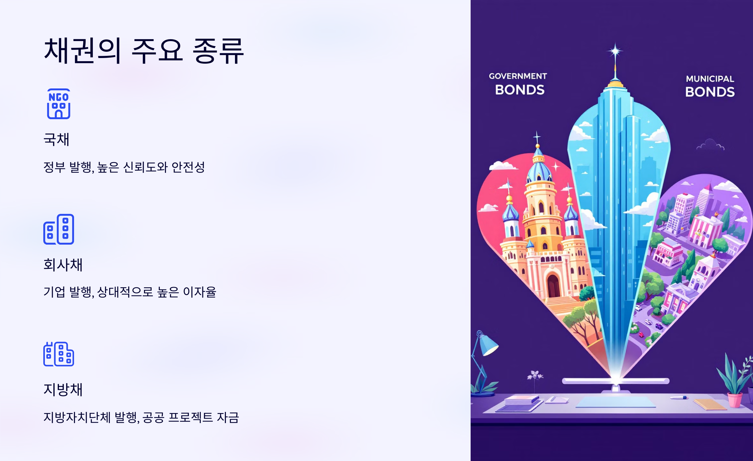 채권은 발행 주체와 조건에 따라 여러 종류로 나뉩니다. 투자 목적에 맞는 채권을 선택하세요.