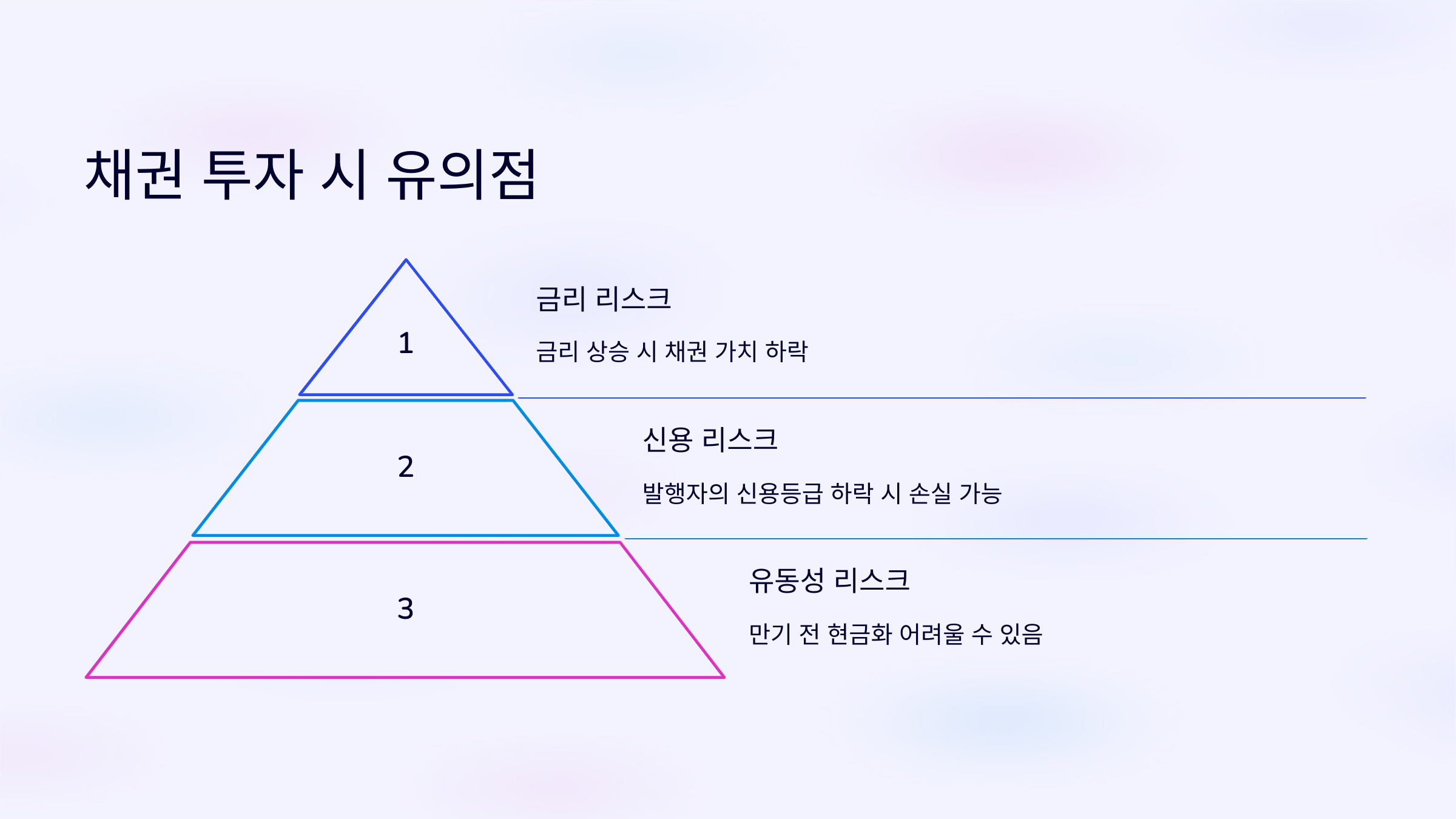 - 금리 리스크: 금리가 오르면 채권 가치 하락.