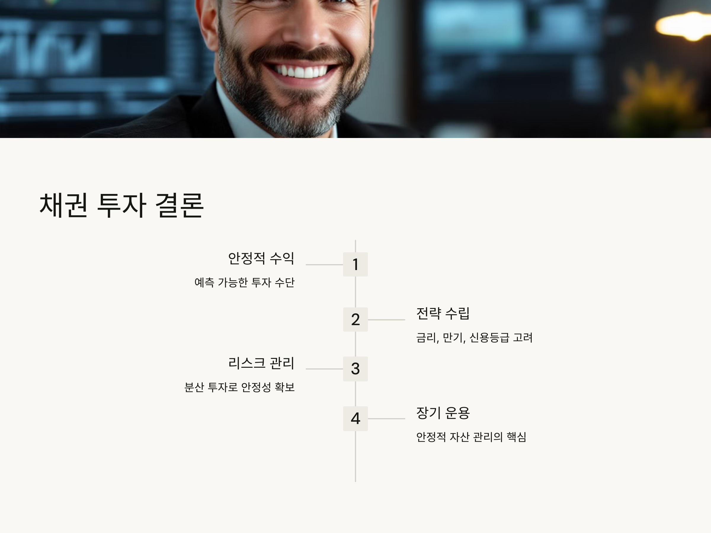 채권 투자는 안정적이고 예측 가능한 수익을 제공하는 중요한 투자 수단입니다. 금리 전망을 정확히 예측하고, 각 채권의 특성에 맞는 투자 전략을 세우는 것이 중요합니다. 채권의 만기, 금리 변화, 신용등급 등 다양한 요소를 고려하여 리스크를 관리하고, 분산 투자 전략을 통해 안정적인 수익을 추구할 수 있습니다.