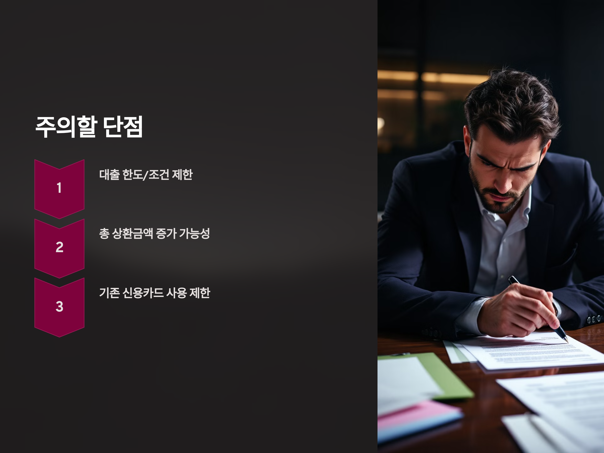 채무통합대출을 받은 후에는 다른 신용카드나 대출을 쉽게 사용하지 못하게 되는 경우가 있습니다. 특히, 기존에 사용하던 신용카드의 한도가 낮아지거나 일시적으로 중지되는 경우가 많습니다. 채무통합대출 후 추가적인 대출이나 카드 사용을 고려하는 분들에게는 불편할 수 있습니다.