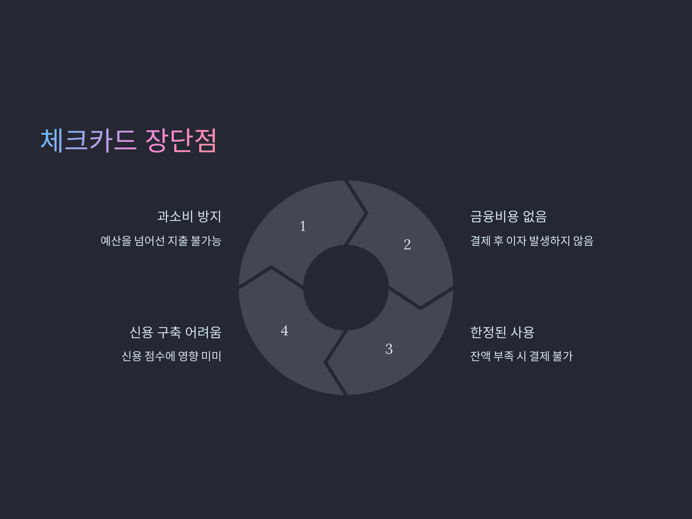 - 연체 및 이자 없음: 신용카드와 달리 결제 후 이자나 연체료가 발생하지 않습니다.