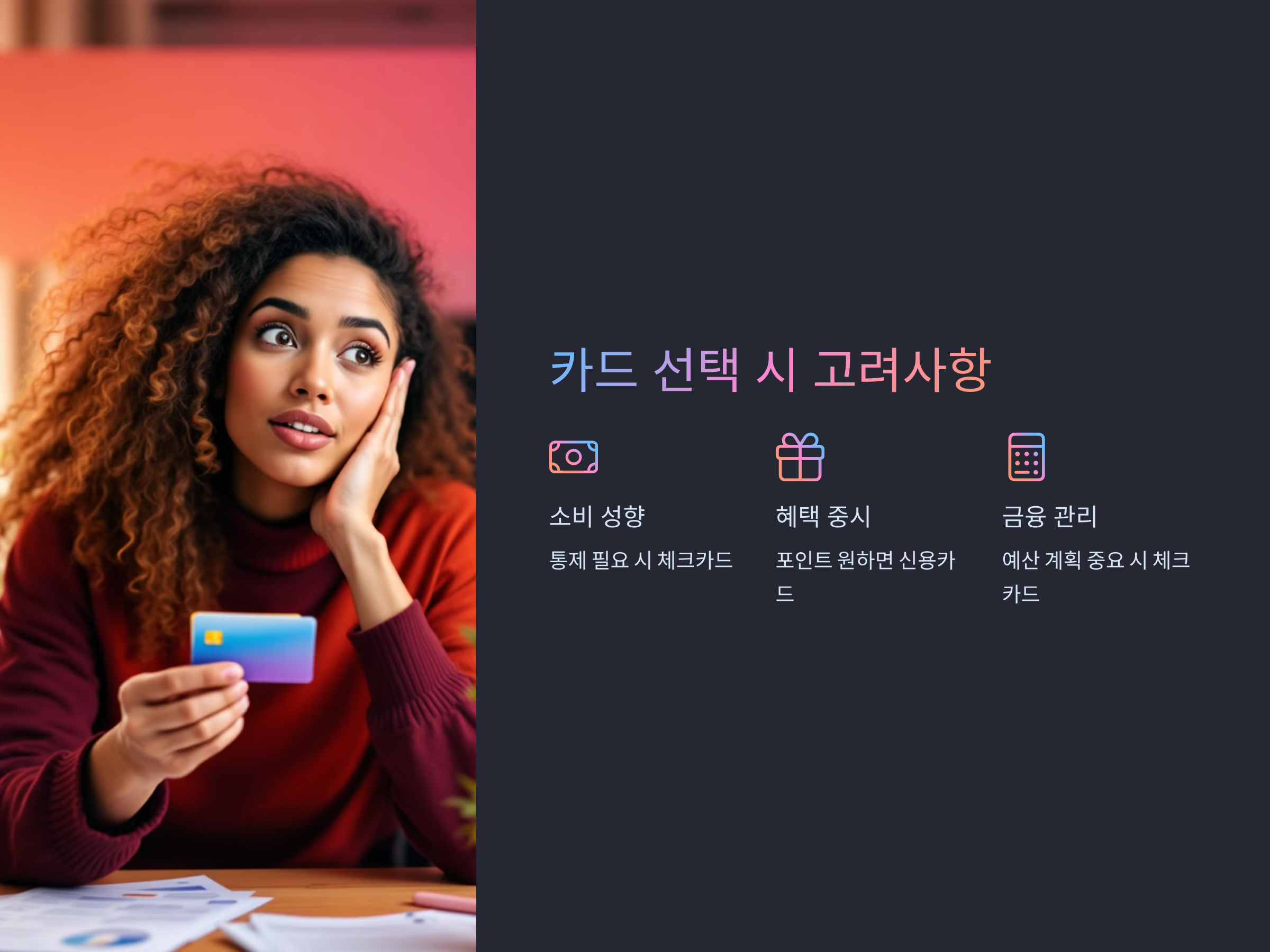 - 자신의 소비 성향 파악: 소비를 잘 통제할 수 있다면 체크카드, 자유로운 소비가 필요하면 신용카드