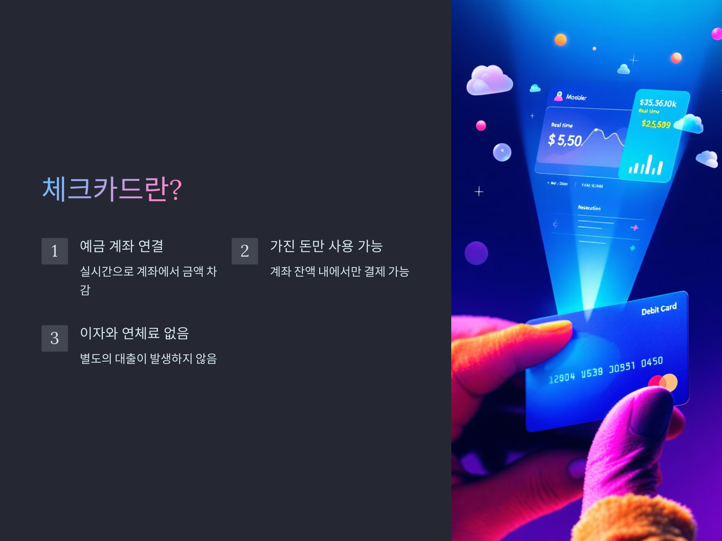 - 과소비 방지: 실제로 내 계좌에 있는 금액만큼만 사용 가능하므로 예산을 넘어서지 않도록 도와줍니다.