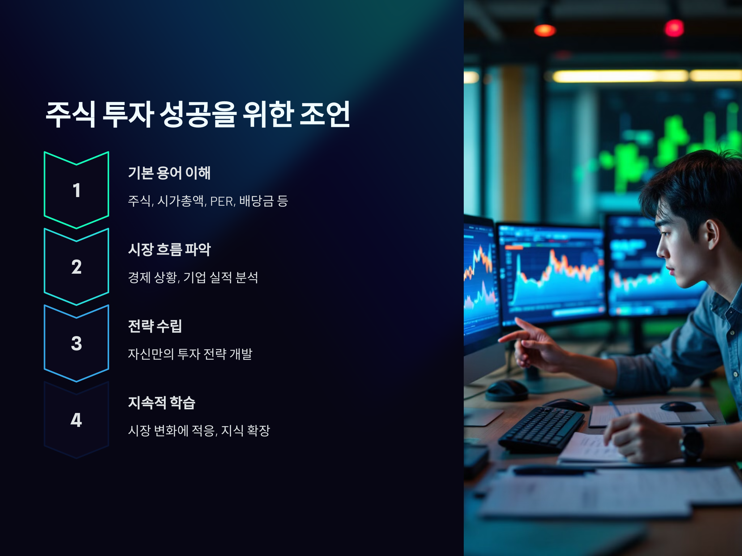 주식 투자를 처음 시작하는 초보자라면 주식의 기본 개념, 시가총액, PER, 배당금, 매수/매도 등의 용어를 먼저 이해하는 것이 중요합니다. 이 용어들이 투자 결정을 내리는 데 큰 도움이 될 것입니다.