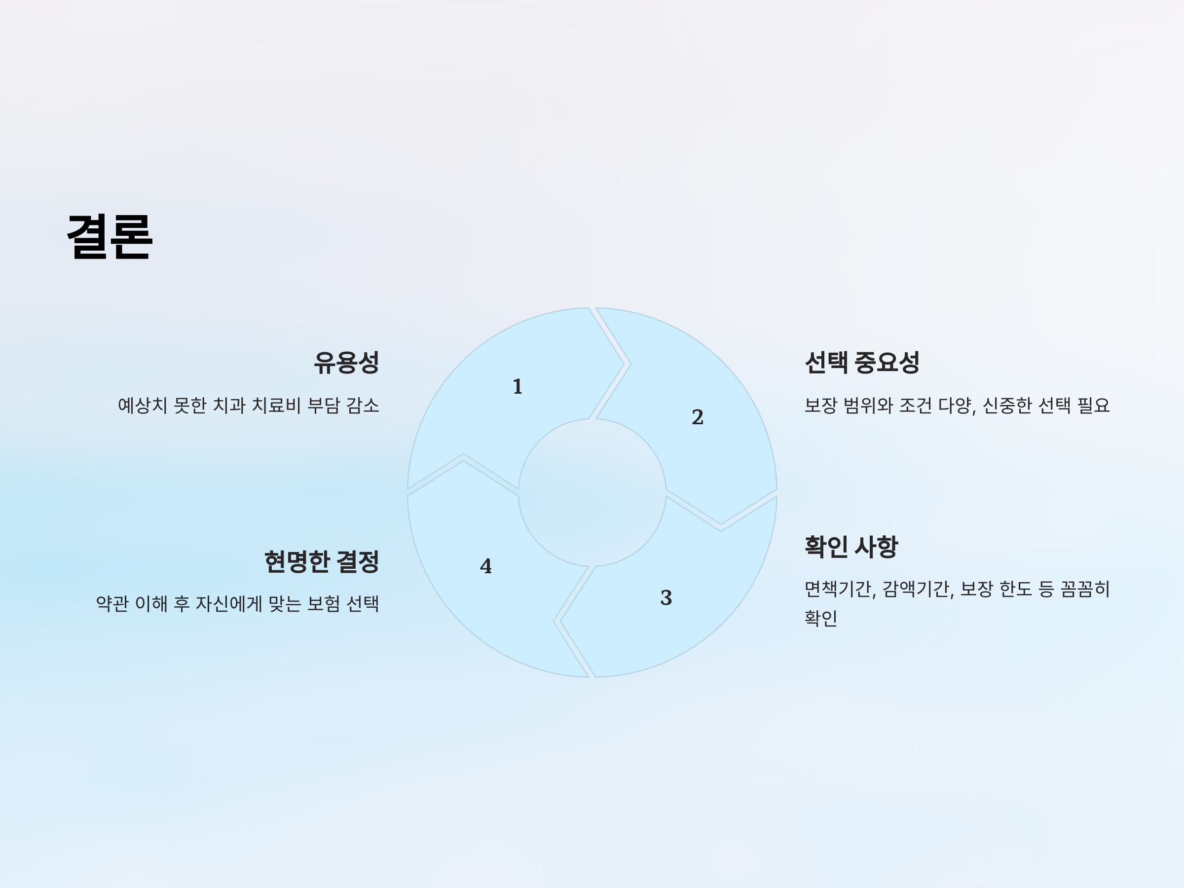 치아보험은 예상치 못한 치과 치료비 부담을 줄여주는 유용한 수단입니다. 그러나 보험사와 상품에 따라 보장 범위와 조건이 다르므로, 가입 전에 자신의 치아 상태와 필요를 고려하여 적합한 보험을 선택하는 것이 중요합니다. 면책기간, 감액기간, 보장 한도 등을 꼼꼼히 확인하고, 약관을 충분히 이해한 후 현명한 선택을 하시기 바랍니다.