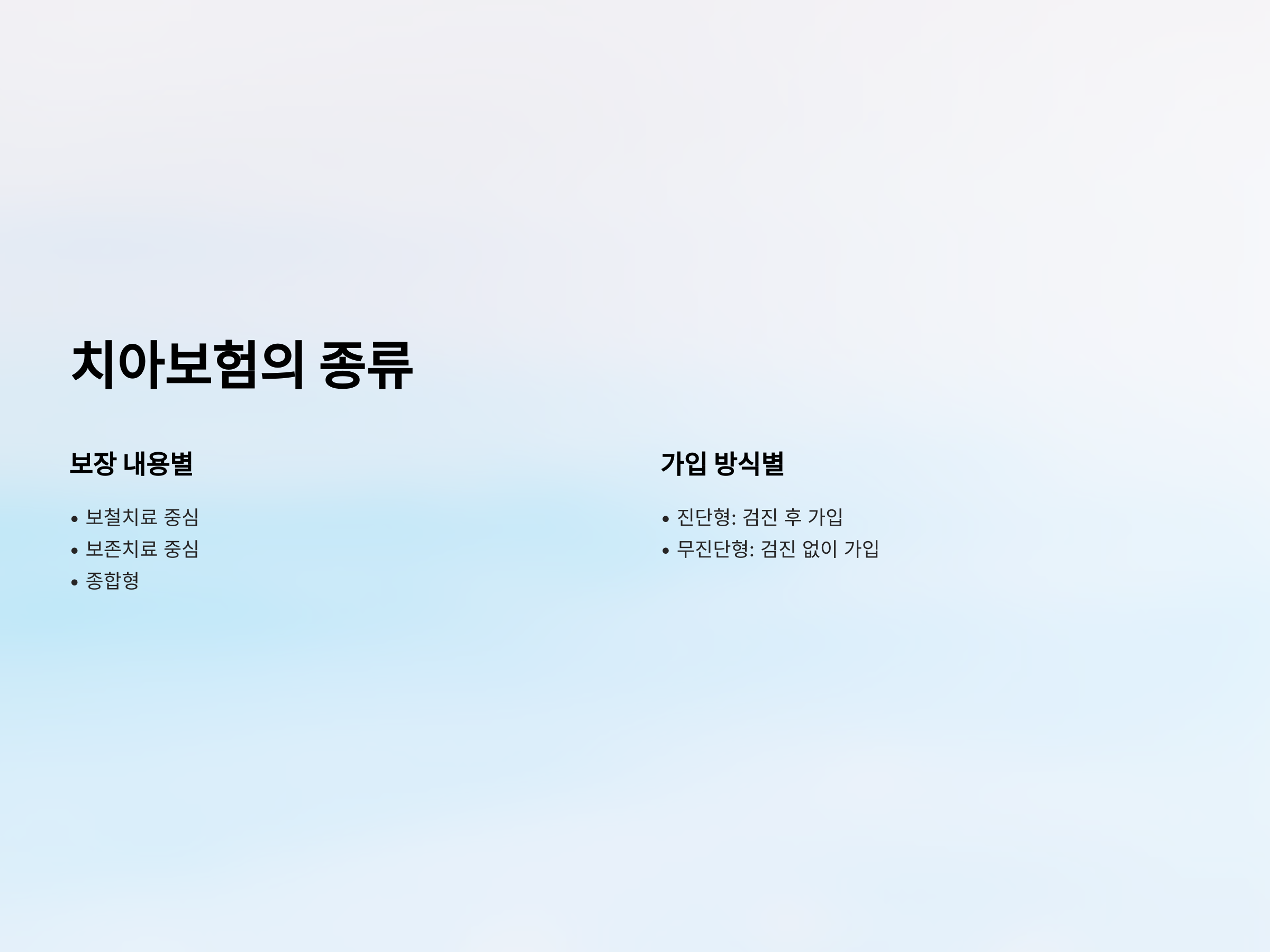 치아보험은 보장 내용과 가입 방식에 따라 다음과 같이 구분됩니다: