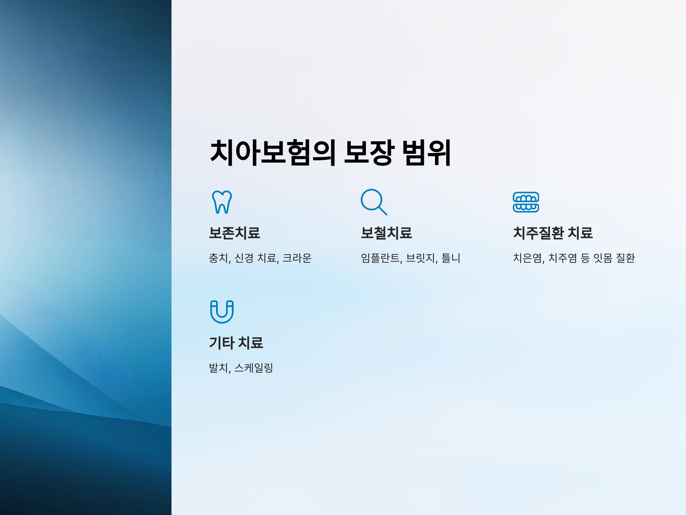 - 보존치료 중심 보험: 충치 치료, 신경 치료 등 일반적인 치과 치료를 보장