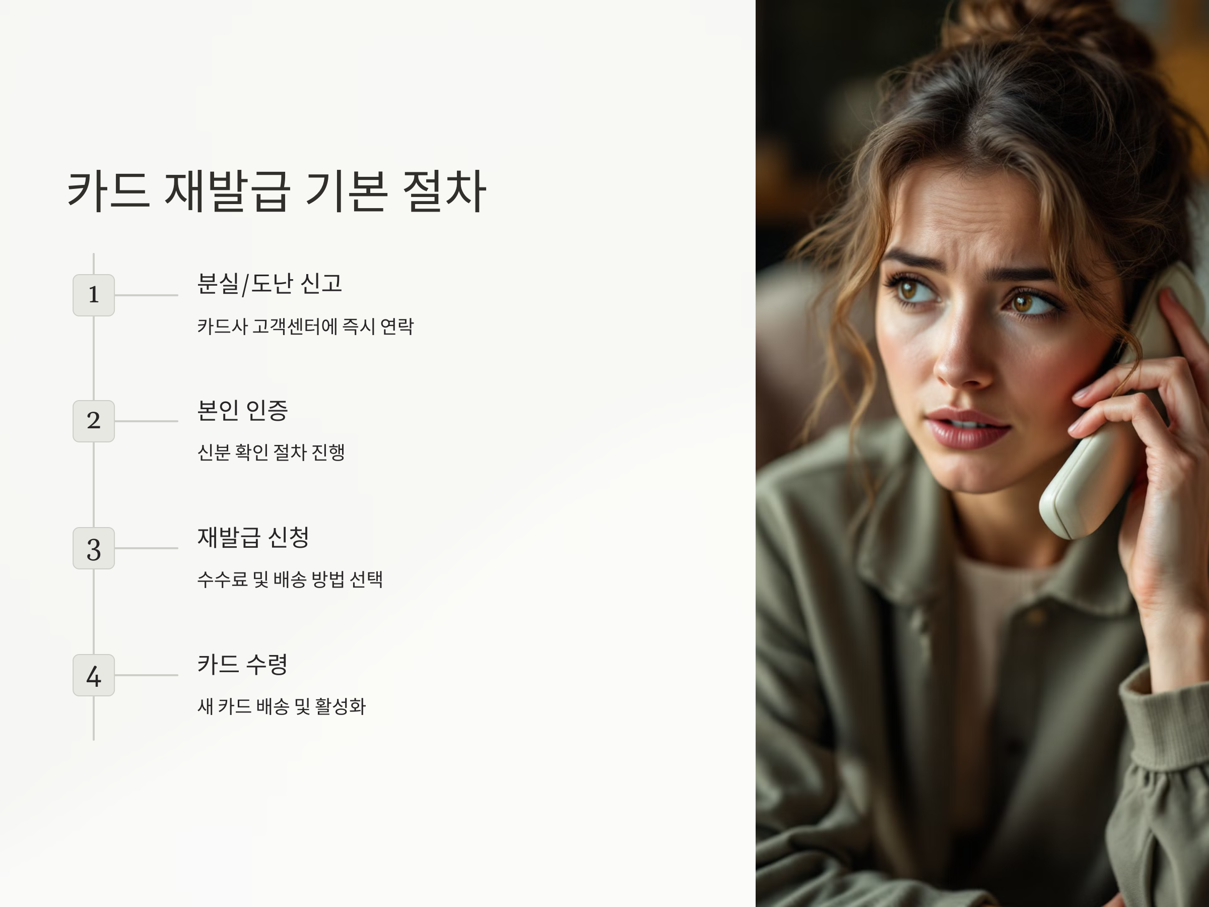 카드를 분실하거나 도난당했을 경우, 바로 카드사에 연락하여 카드의 정지 처리를 해야 합니다. 이를 통해 카드의 부정 사용을 예방할 수 있습니다. 카드사의 고객센터 전화번호를 통해 카드 정지 후, 재발급 절차를 진행할 수 있습니다.