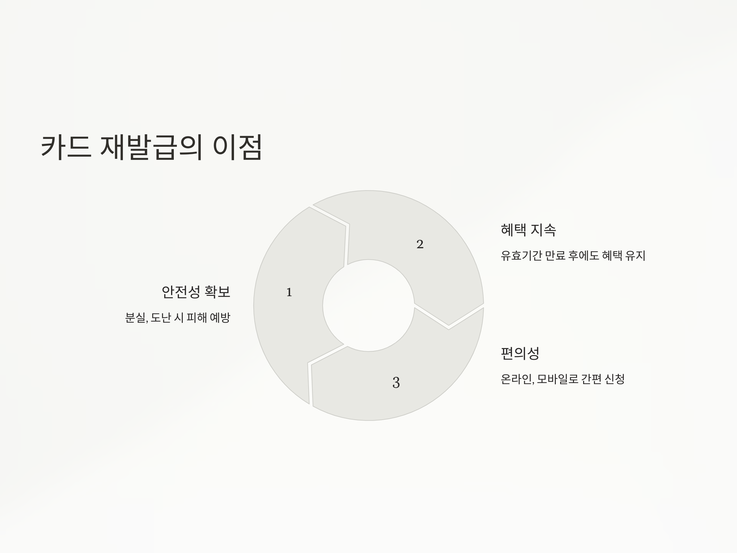 카드를 재발급받는 것에는 여러 가지 이점이 있습니다. 카드 분실이나 도난으로 인한 피해를 예방할 수 있고, 유효기간이 만료된 카드를 계속 사용해야 하는 불편을 없앨 수 있습니다.