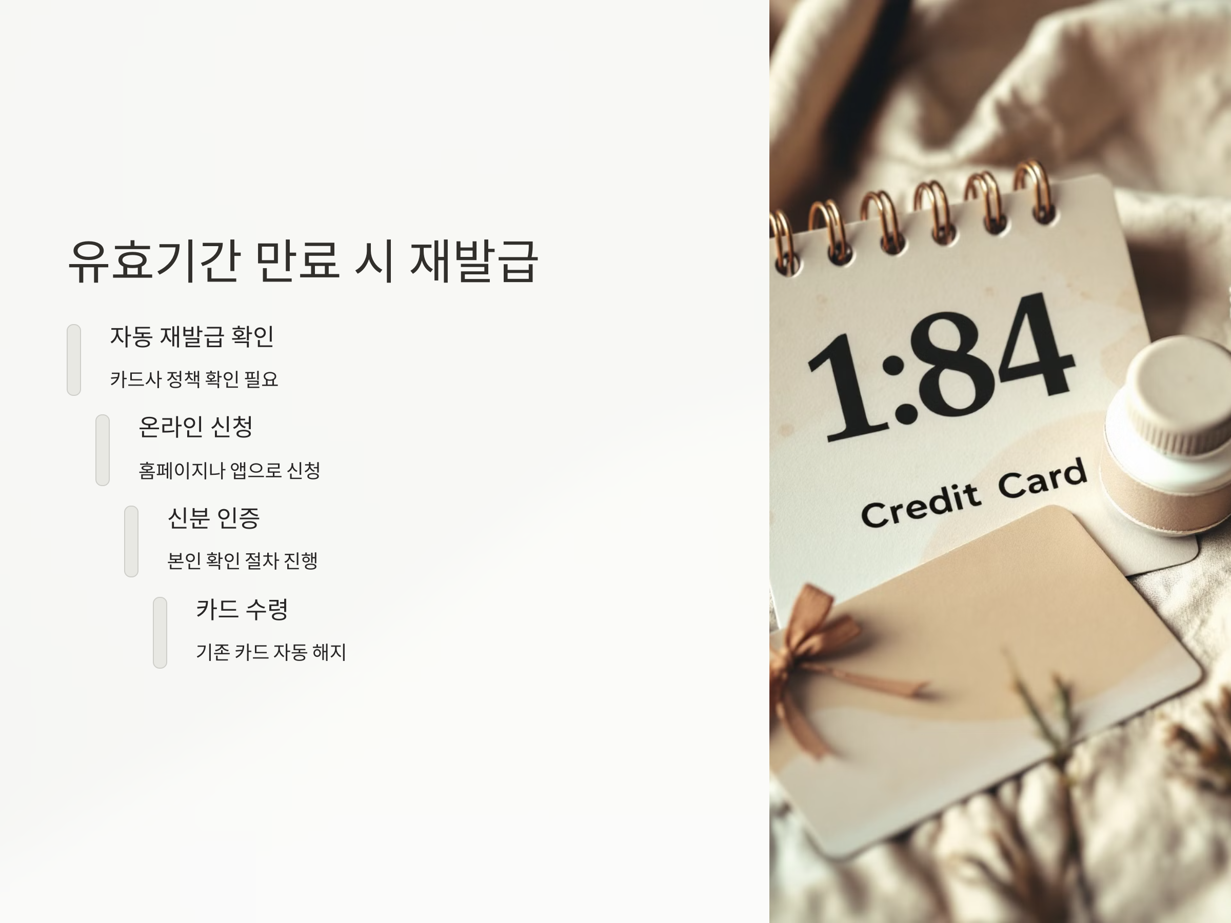 카드의 유효기간이 만료되었을 경우, 자동으로 재발급이 진행되는 경우도 있지만, 카드사가 이를 활성화해주지 않는다면 본인이 직접 신청해야 할 수도 있습니다. 이 경우, 카드사 홈페이지나 앱을 통해 신청할 수 있습니다.
