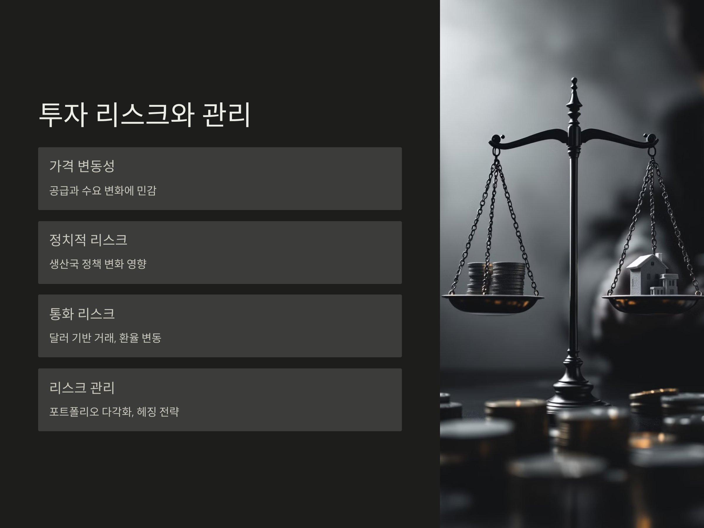 커머더티 투자는 매우 높은 변동성을 특징으로 합니다. 그만큼 리스크 관리가 중요한 요소가 됩니다. 주요 리스크 요인으로는 다음과 같습니다:
