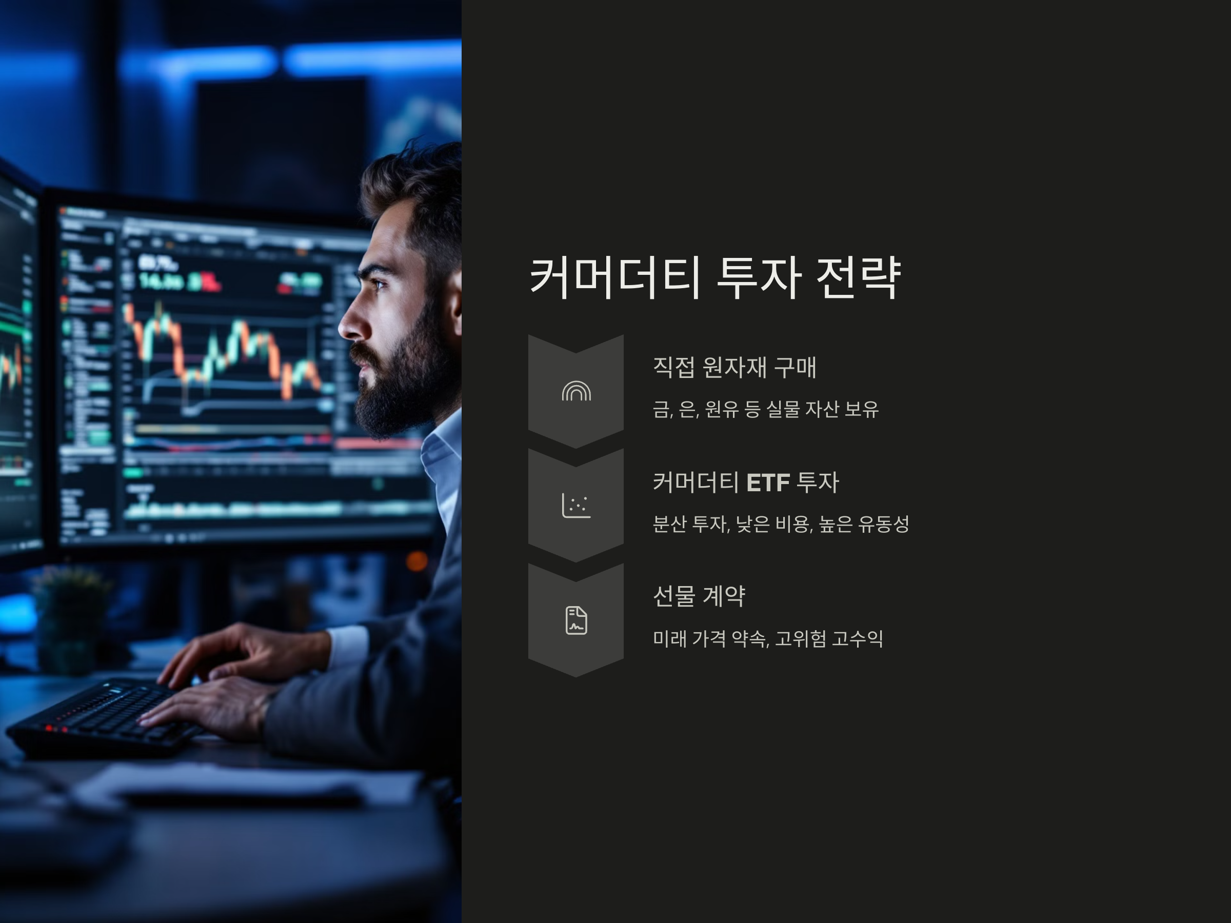 커머더티 투자에는 여러 가지 전략이 존재하며, 각 전략은 투자자의 리스크 성향과 시장 전망에 따라 달라질 수 있습니다. 일반적인 전략으로는 다음과 같은 방법들이 있습니다.