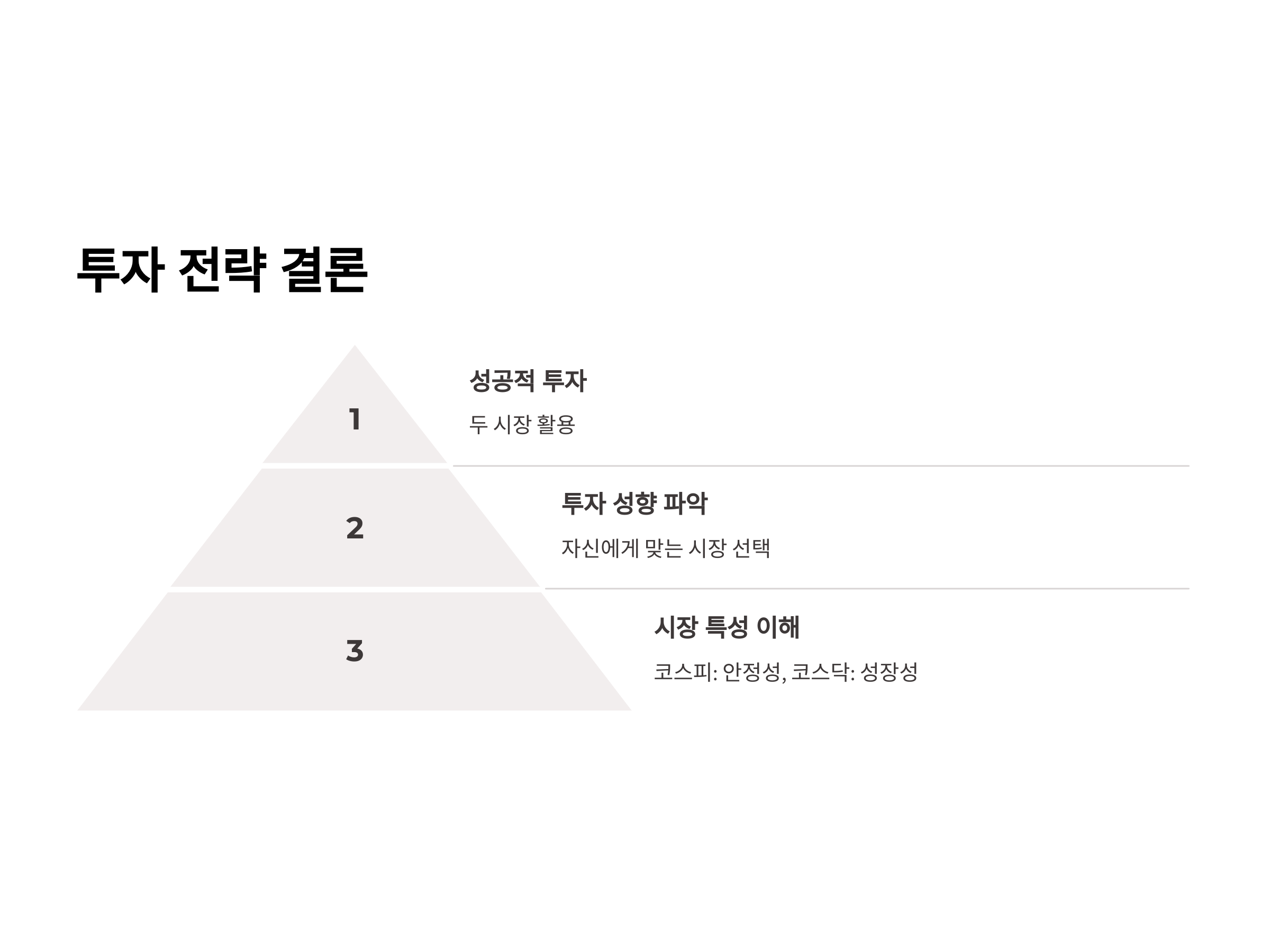 코스피는 안정적인 수익을 원하는 투자자에게 적합하며, 리스크가 상대적으로 적습니다. 그러나 이는 고수익을 기대하기 어려운 특성도 있습니다. 반면, 코스닥은 더 큰 리스크를 안고 있지만, 그만큼 수익률이 높을 수 있는 기회가 많습니다. 즉, 코스피는 "안정성"을 추구하고, 코스닥은 "성장 가능성"과 "고수익"을 추구하는 투자자에게 유리합니다.