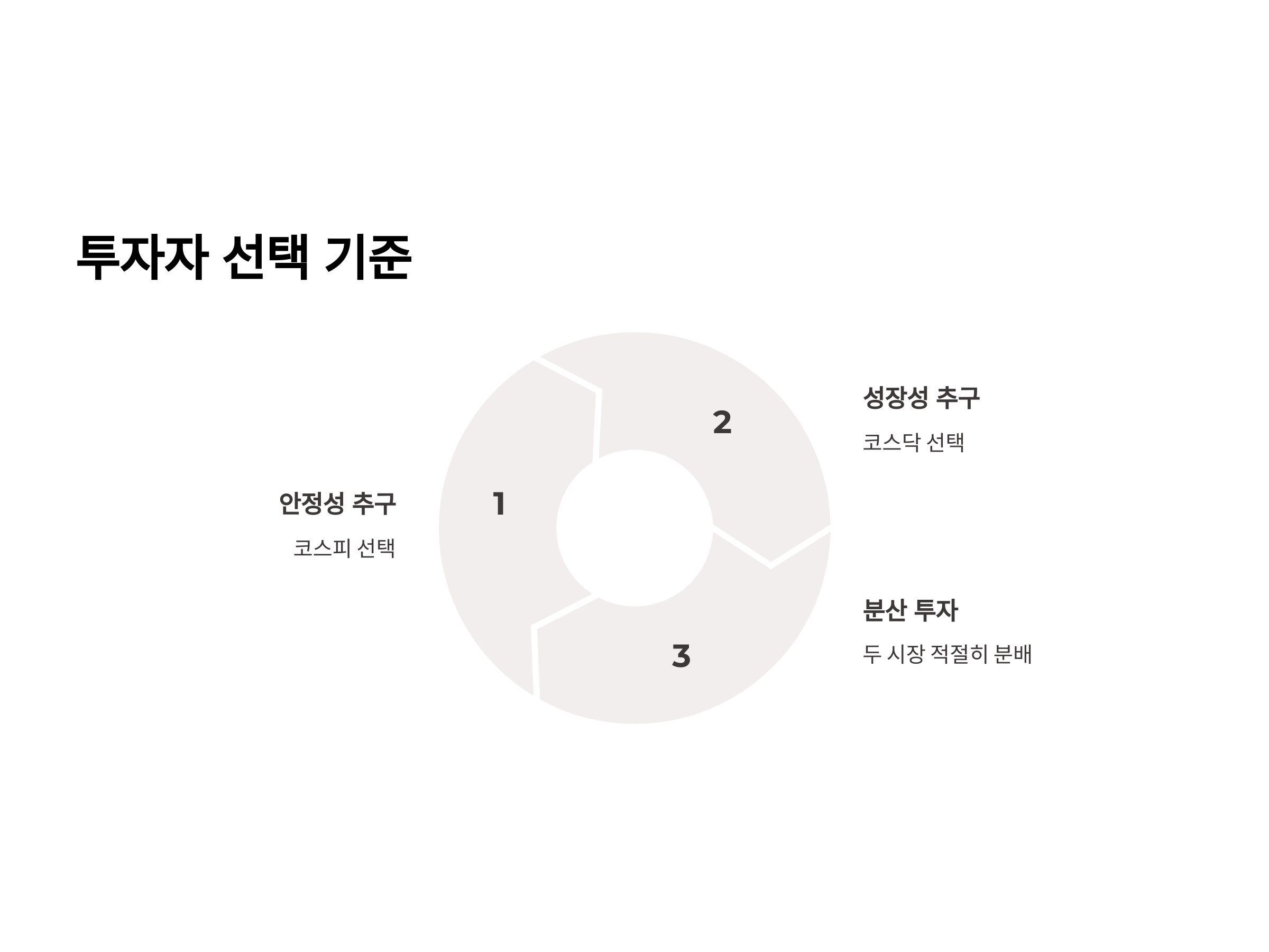 투자자들이 코스피와 코스닥을 선택하는 기준은 주로 투자 성향에 달려 있습니다. 안정적인 자산 증식을 원한다면 코스피가 적합하고, 높은 성장 가능성을 보고 투자한다면 코스닥이 더 나은 선택이 될 수 있습니다. 또한, 각 시장의 특성을 잘 이해하고 투자 전략을 세운다면 두 시장을 적절히 분배하여 리스크를 관리할 수도 있습니다.