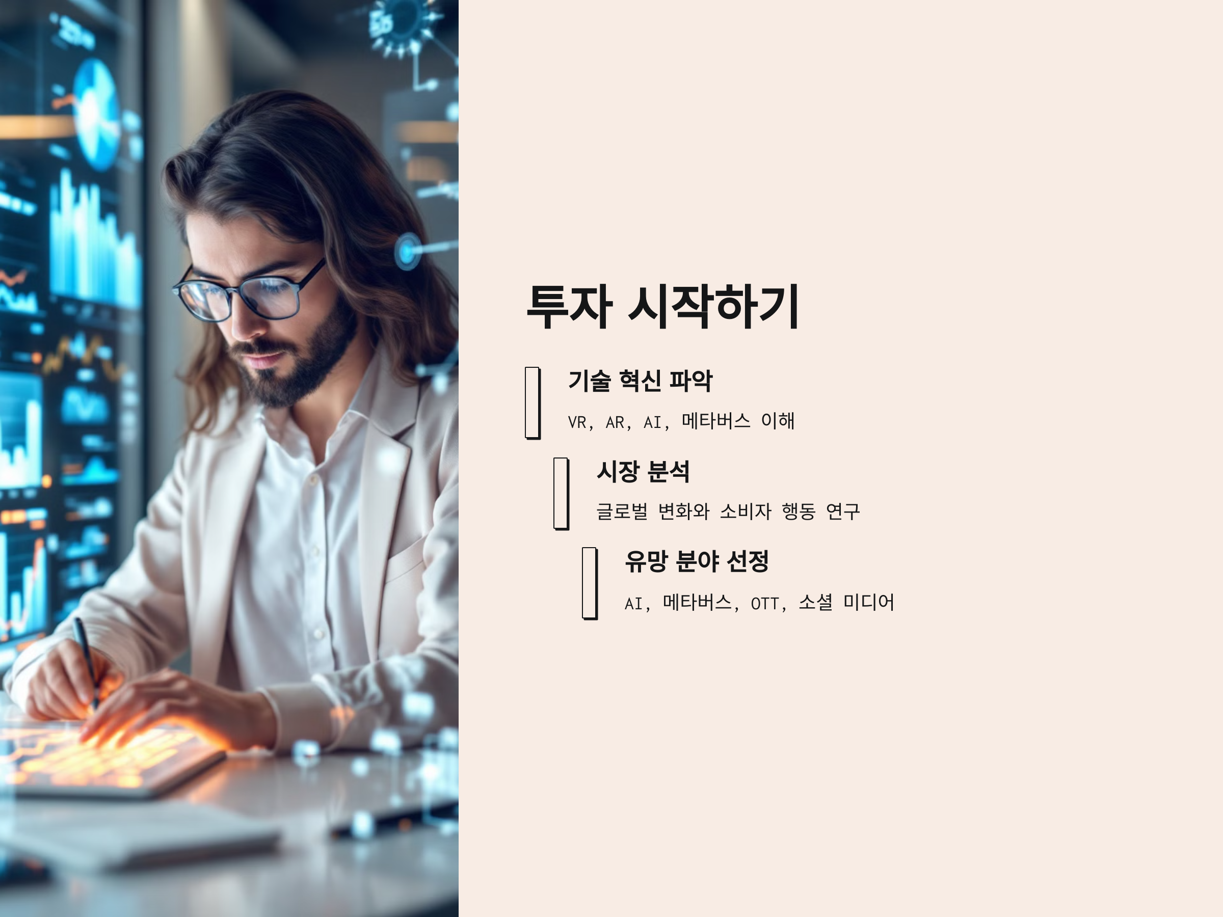 콘텐츠 산업에 대한 투자를 시작하려면, 먼저 기술 혁신을 파악하는 것이 중요합니다. VR, AR, AI, 메타버스 등 최신 기술에 대한 이해가 필요하며, 해당 기술들이 실제 콘텐츠 산업에 어떻게 적용되는지에 대해 연구해야 합니다. 또한, 글로벌 시장의 변화와 소비자 행동을 분석하여 어떤 분야에 투자할지를 결정하는 것이 중요합니다.