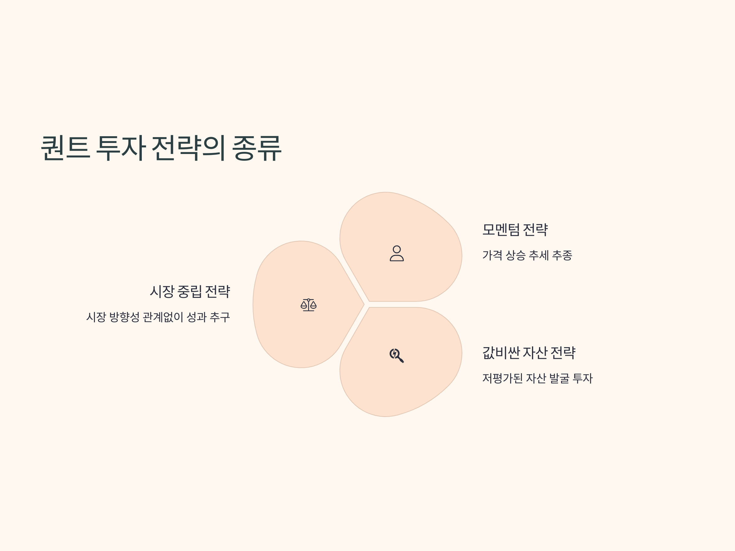 퀀트 투자 전략은 여러 가지가 있으며, 그 종류에 따라 각기 다른 방식으로 투자 결정을 내립니다. 퀀트 전략의 종류는 크게 ‘시장 중립 전략’, ‘모멘텀 전략’, 그리고 ‘값비싼 자산 전략’ 등으로 구분할 수 있습니다.