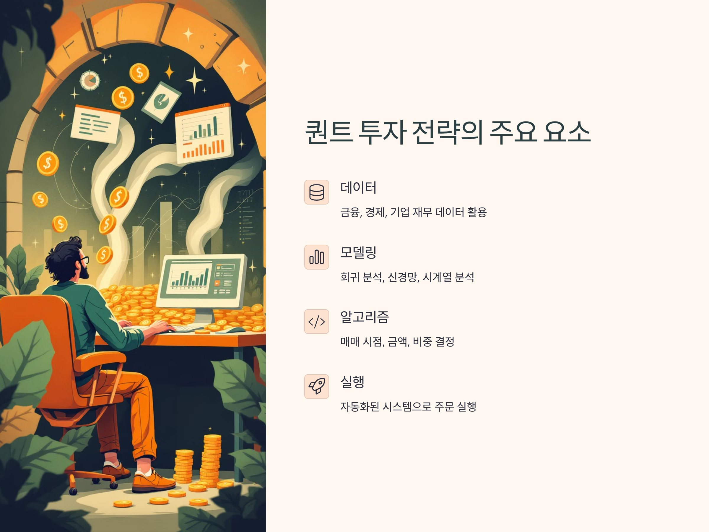 퀀트 투자 전략의 핵심은 철저한 데이터 분석에 있습니다. 이를 위해 다양한 데이터 소스를 활용하여 시장의 흐름을 예측하고, 이를 바탕으로 투자 결정을 내립니다. 퀀트 전략에서 중요한 요소는 크게 4가지로 나눌 수 있습니다: 데이터, 모델링, 알고리즘, 그리고 실행입니다.