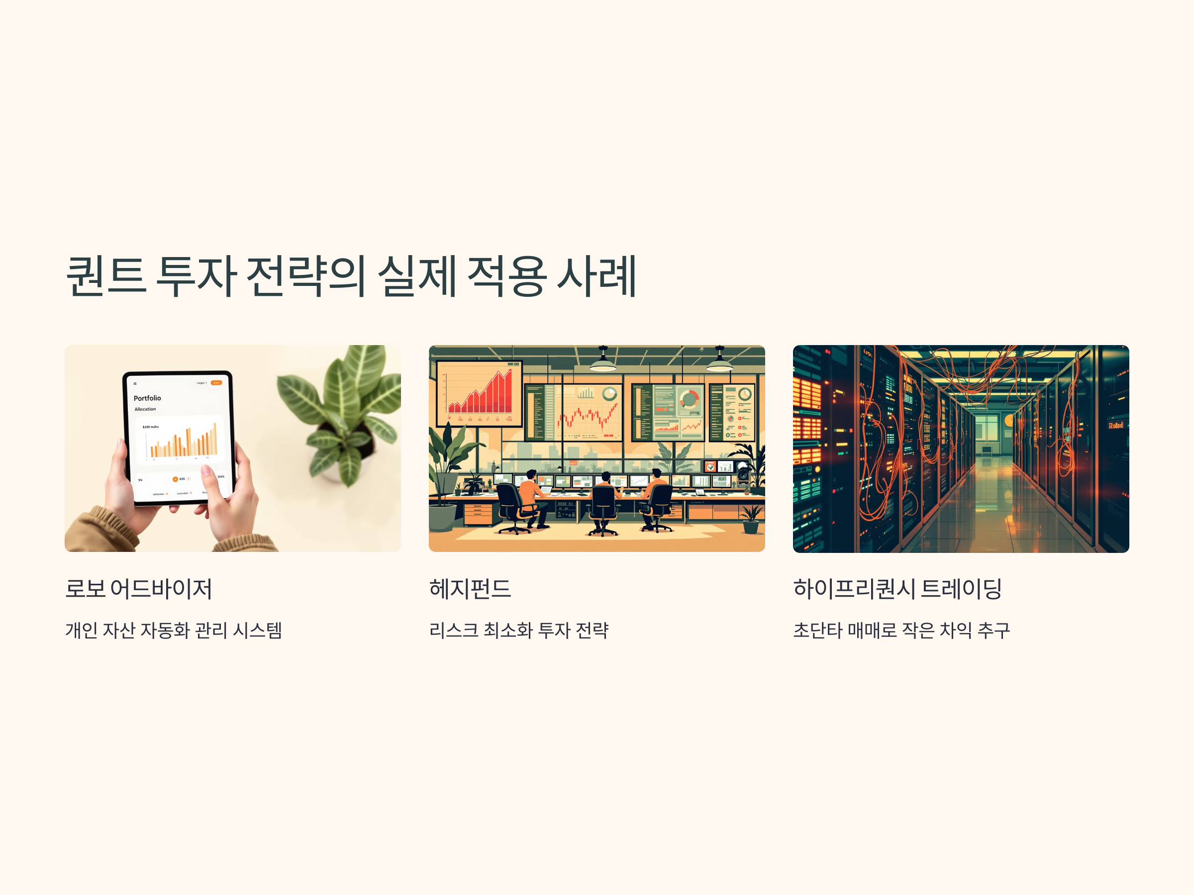 퀀트 투자 전략은 이미 많은 투자자와 기관에서 실제로 적용되고 있습니다. 대표적인 퀀트 투자 전략의 적용 사례로는 로보 어드바이저, 헤지펀드, 그리고 하이프리퀀시 트레이딩(HFT) 등이 있습니다.