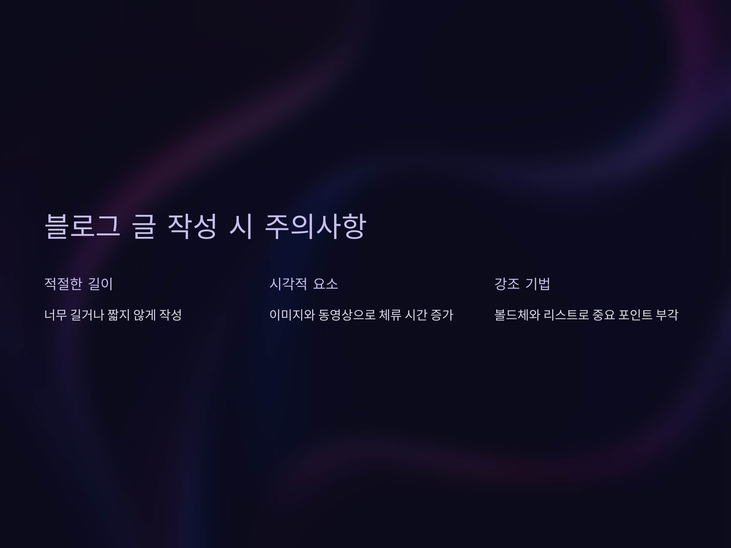 블로그 글을 작성할 때, 주의할 점은 너무 길거나 짧지 않게 작성하는 것입니다. 사람들은 긴 글을 읽는 것보다는 간결하고 명확한 정보를 선호하는 경향이 있습니다. 따라서, 각 문단은 충분히 설명이 되어 있으면서도 불필요한 부분은 제외해야 합니다. 특히, 중요한 포인트는 볼드체로 강조하거나, 리스트 형식으로 정리하면 독자가 더 쉽게 정보를 받아들일 수 있습니다.