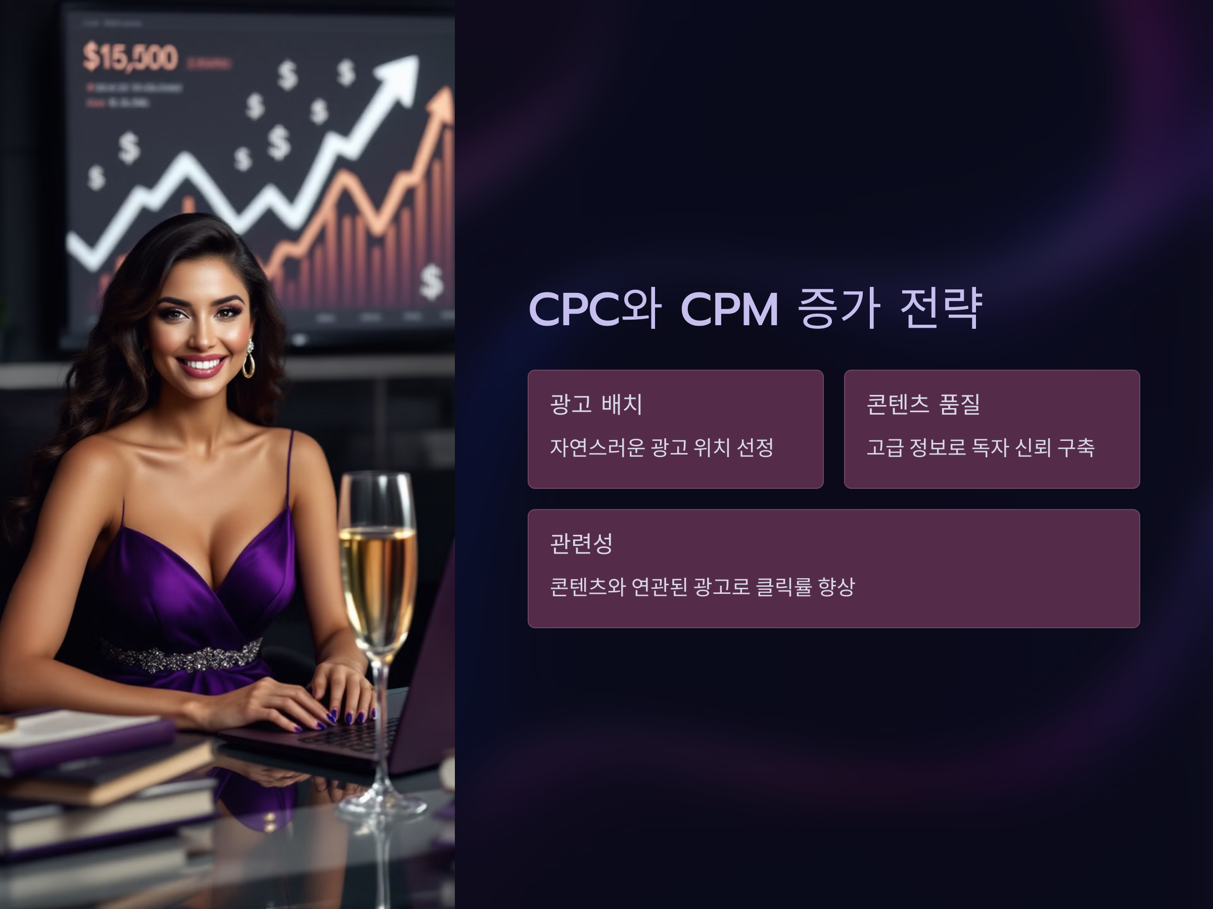 블로그 수익화를 목표로 한다면, CPC(클릭당 비용)와 CPM(1000회 노출당 비용)을 증가시키는 것도 매우 중요합니다. CPC와 CPM을 높이기 위해서는 광고 배치와 콘텐츠의 품질이 중요한 요소입니다. 예를 들어, 관련성 높은 광고를 블로그 콘텐츠에 적절히 배치하면, 클릭을 유도하고 수익을 증가시킬 수 있습니다.