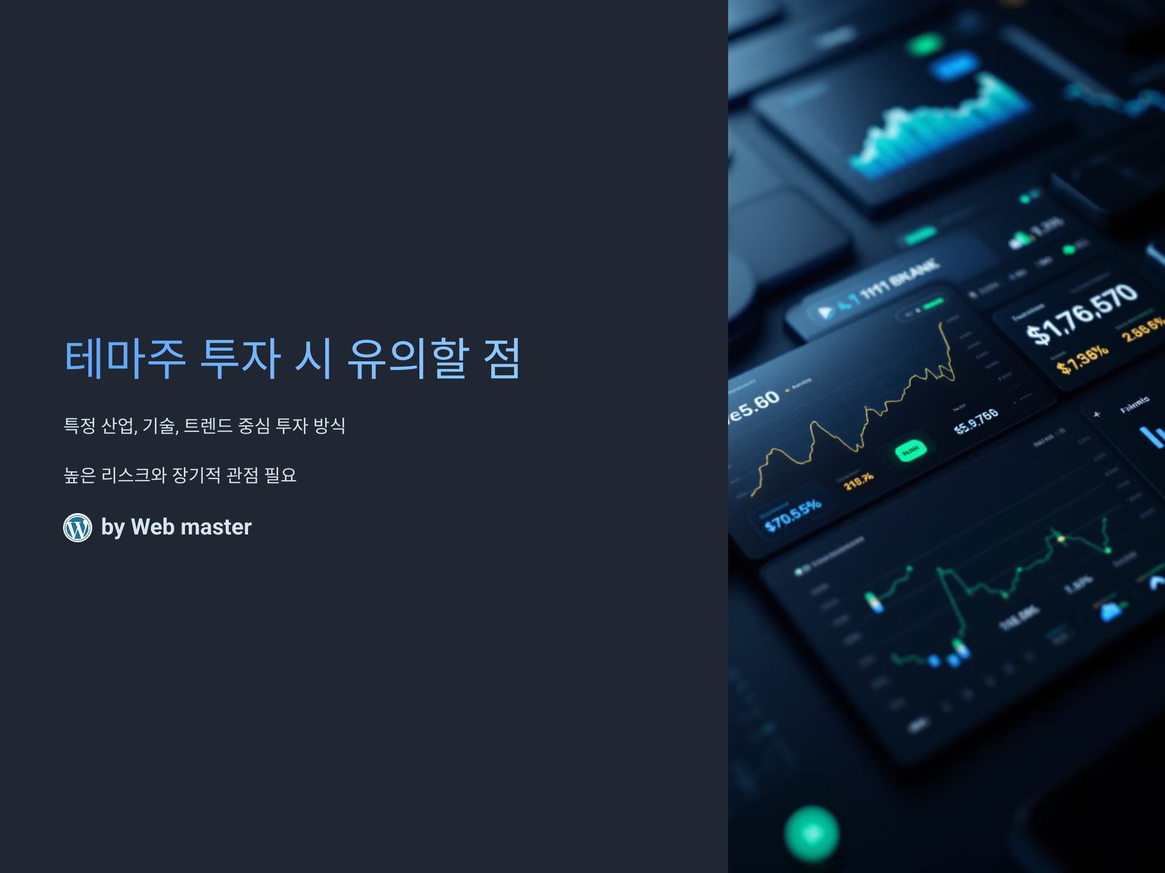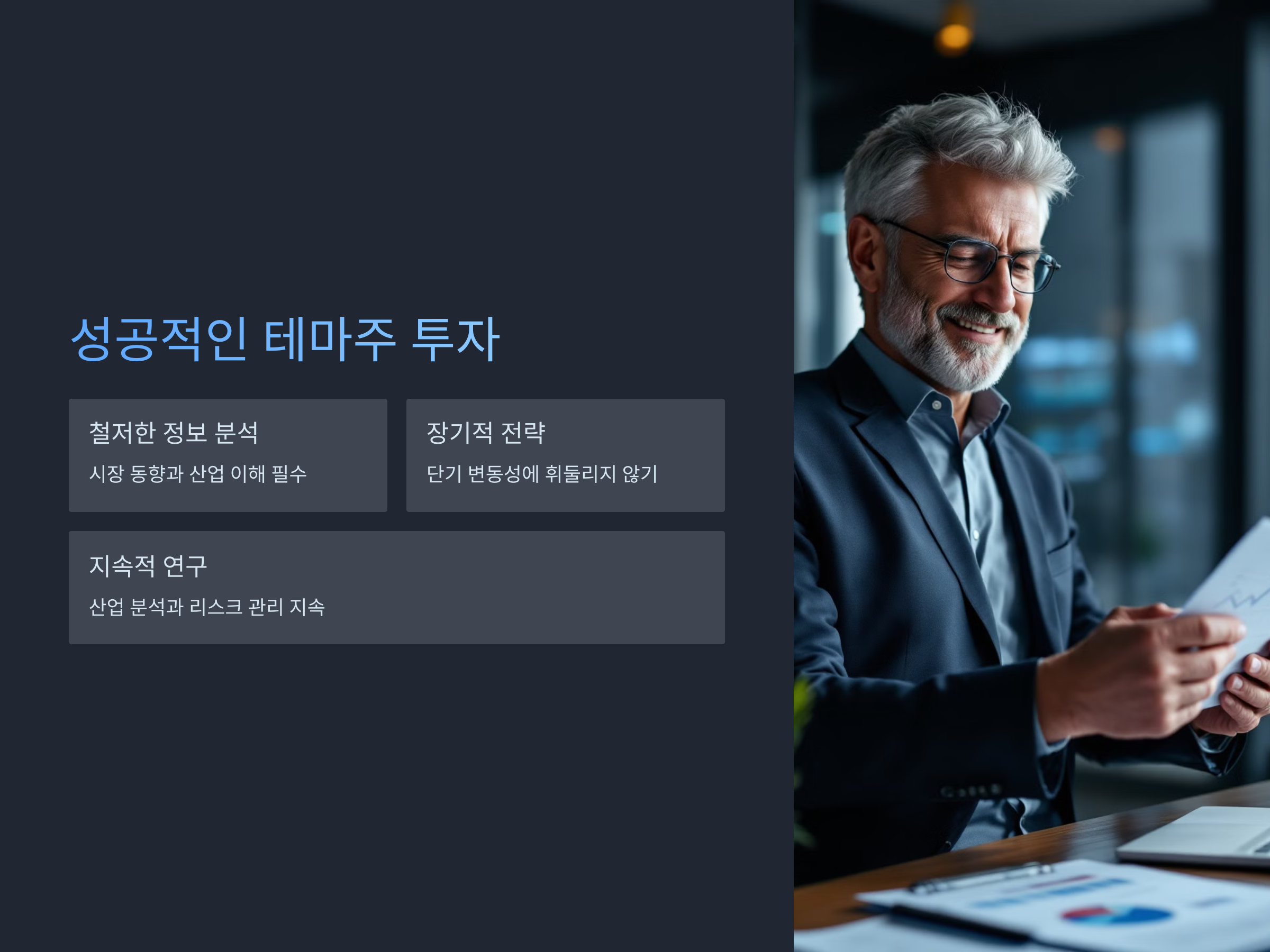 테마주 투자는 높은 수익을 안겨줄 수 있는 기회를 제공하지만, 동시에 큰 리스크도 동반할 수 있습니다. 이를 위해 투자자는 반드시 철저한 정보 분석과 시장 동향에 대한 깊은 이해를 바탕으로 투자를 결정해야 합니다. 또한, 단기적인 변동성에 휘둘리지 않도록 장기적인 관점에서의 투자 전략을 세우는 것이 중요합니다. 마지막으로, 테마주 투자에서 성공하기 위해서는 꾸준히 해당 산업에 대한 연구와 분석을 지속해야 하며, 항상 리스크를 관리하는 것이 투자 성공의 핵심입니다.