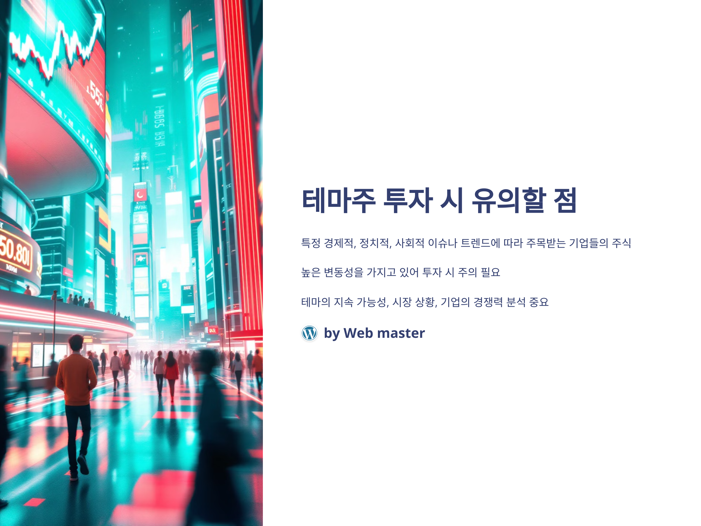 테마주에 투자할 때 가장 중요한 것은 리스크 관리입니다. 테마주들은 대부분 강력한 상승세를 보이지만, 그만큼 급격한 하락세를 겪을 가능성도 큽니다. 예를 들어, 특정 테마가 정부 정책의 변화나 글로벌 경제 상황에 따라 영향을 받을 수 있습니다. 예를 들어, 전기차와 관련된 테마주는 정부의 정책 지원을 받지만, 만약 정책 방향이 바뀌거나 기술적 혁신이 늦어질 경우 큰 손실을 볼 수 있습니다.