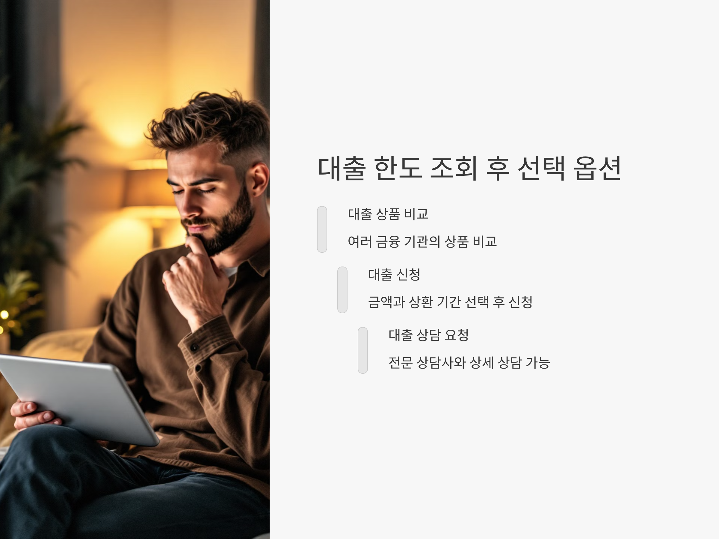 이 과정을 통해 대출 한도를 간편하게 조회할 수 있으며, 바로 대출을 신청하거나 추가 상담을 받을 수 있는 옵션도 제공합니다.