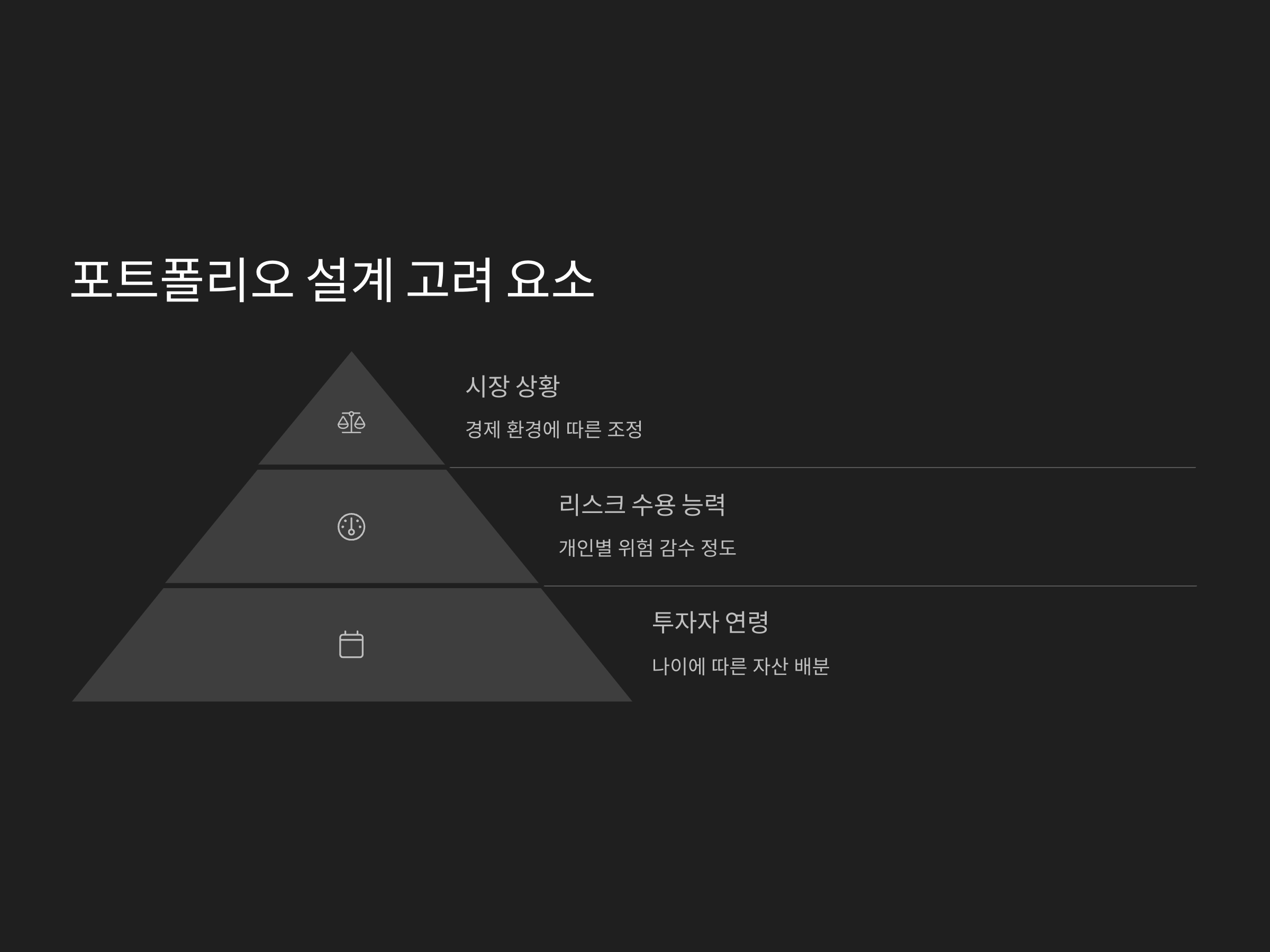 퇴직연금 포트폴리오를 설계할 때는 단순히 자산군 비율을 맞추는 것만으로는 부족합니다. 아래의 요소들을 함께 고려하여 포트폴리오를 최적화해야 합니다.