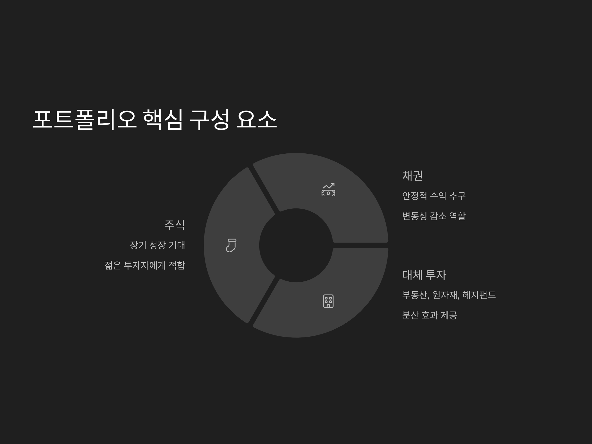 대체 투자에는 부동산, 원자재, 헤지펀드, 그리고 사모펀드 등이 포함됩니다. 대체 투자는 전통적인 자산군인 주식이나 채권과 상관관계가 적기 때문에, 포트폴리오에 추가하면 분산 투자 효과를 얻을 수 있습니다. 특히, 부동산은 장기적인 자산 가치 상승을 기대할 수 있으며, 일정 부분 리스크를 감수할 수 있는 투자자에게 적합합니다.