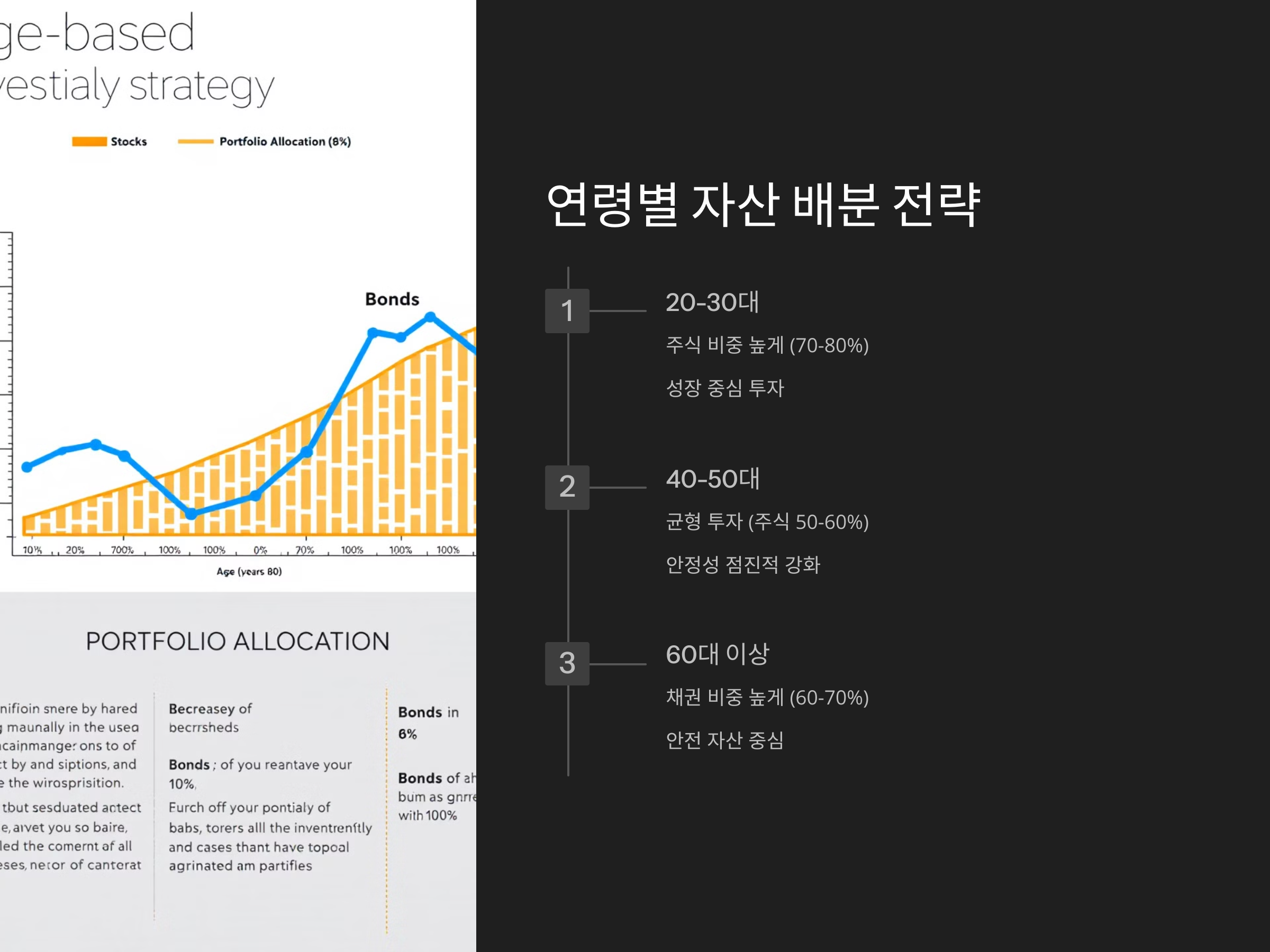 하나의 자산군에 집중하는 것은 위험이 따르므로, 다양한 자산에 분산 투자하는 전략이 필요합니다. 주식, 채권, 대체 자산을 적절히 분배하여 리스크를 줄이고, 안정적인 수익을 목표로 해야 합니다.