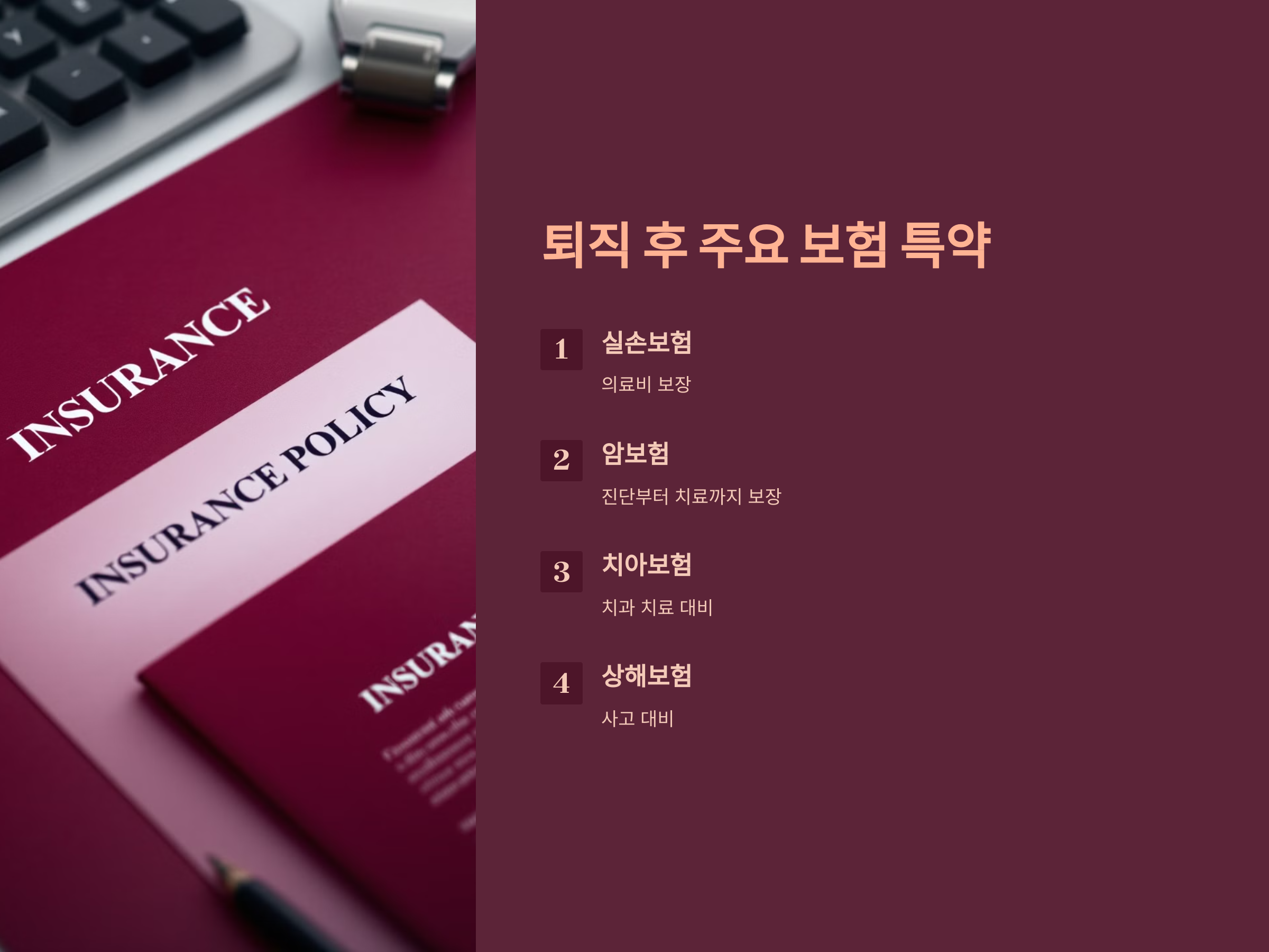 - 퇴직 후에도 실손보험은 계속 유지하는 것이 좋습니다. 실손보험은 의료비 부담을 줄여주는 중요한 특약입니다.