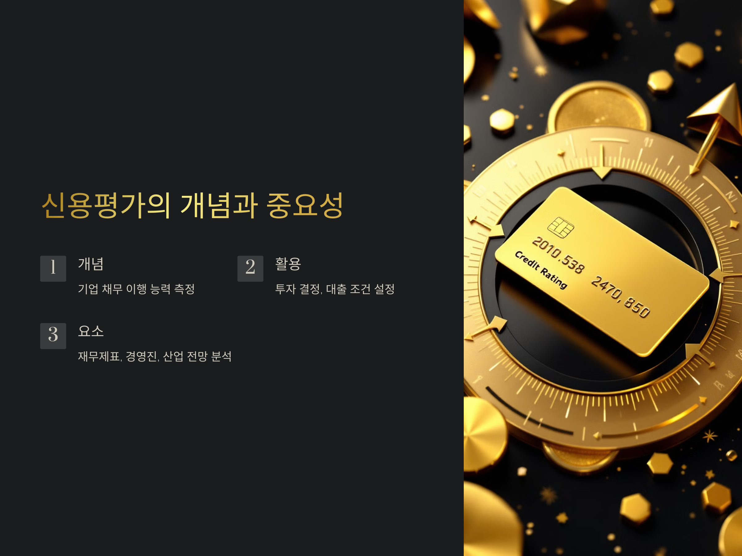 - ESG 요소: 환경 보호, 사회적 책임, 지배구조 투명성 등 비재무적 요소도 신용평가에 반영됩니다.