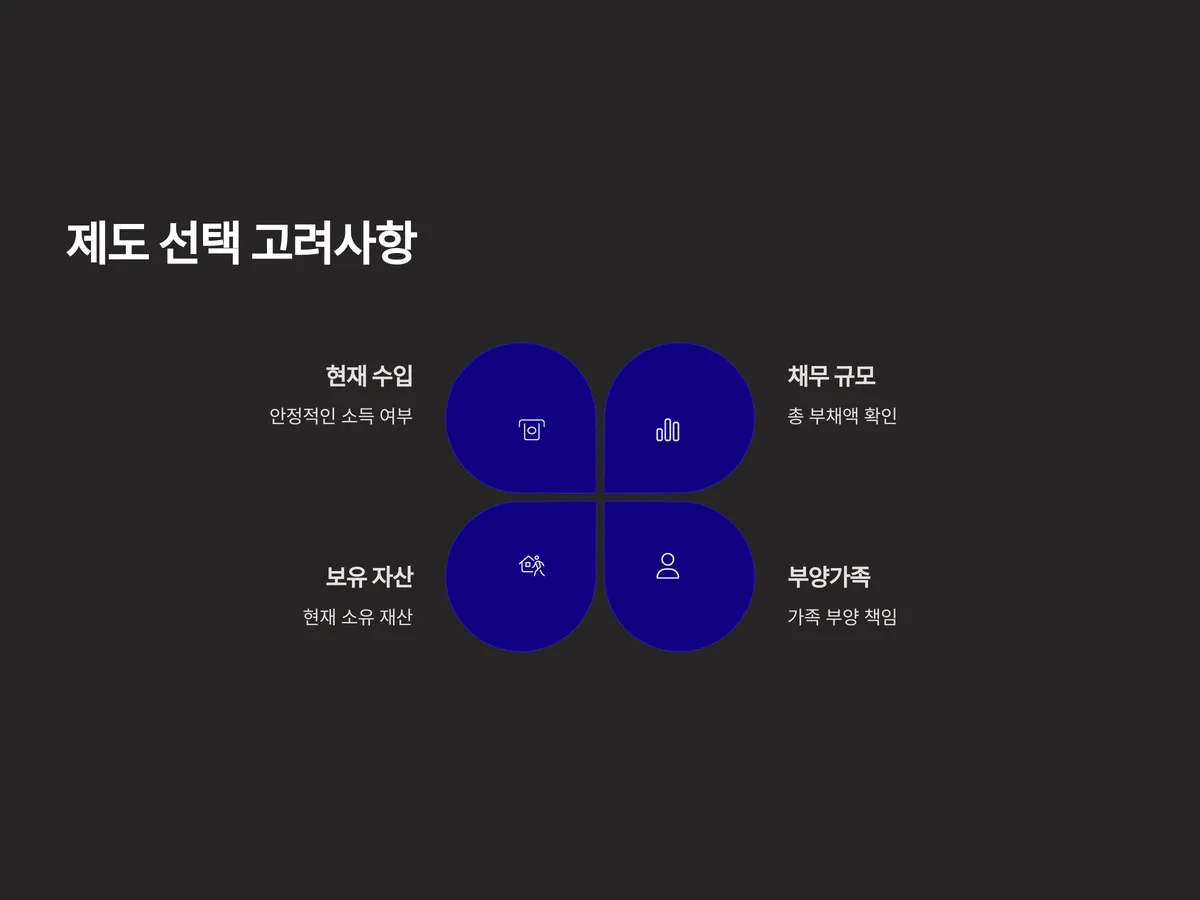 제도를 선택할 때 가장 중요한 요소는 '현재 수입', '채무 규모', '부양가족 유무', '보유 자산'입니다. 일정한 수입이 있어도 채무가 너무 많다면 파산을 고려할 수 있고, 자산이 있더라도 채권자 압류를 피하고 싶다면 개인회생이 유리할 수 있습니다.