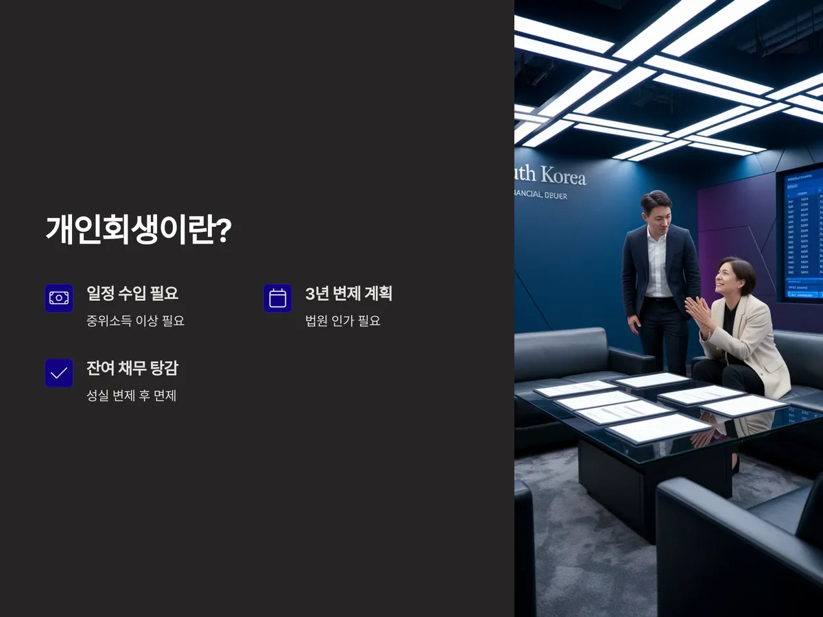 개인회생은 일정한 수입이 있는 개인이 채무를 법적으로 조정받아 3년 내 상환하고, 잔여 채무는 탕감받는 제도입니다. 법원의 인가를 받아야 하며, 월평균 소득이 중위소득 이상이거나 일정 수준 이상인 경우에 신청할 수 있습니다.