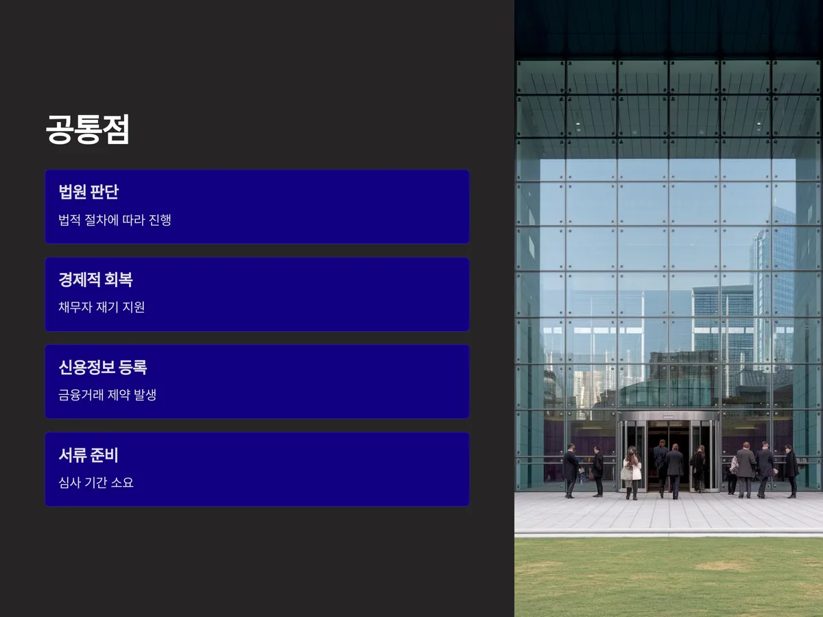 두 제도 모두 법원의 판단 아래 운영되며, 채무자의 경제적 회복을 돕는 공적 제도입니다. 채권자 보호와 동시에 채무자의 최소한의 생계를 보장하는 방향으로 설계되어 있으며, 사회적 낙인을 줄이고 금융 거래 정상화를 돕는 기능도 있습니다.