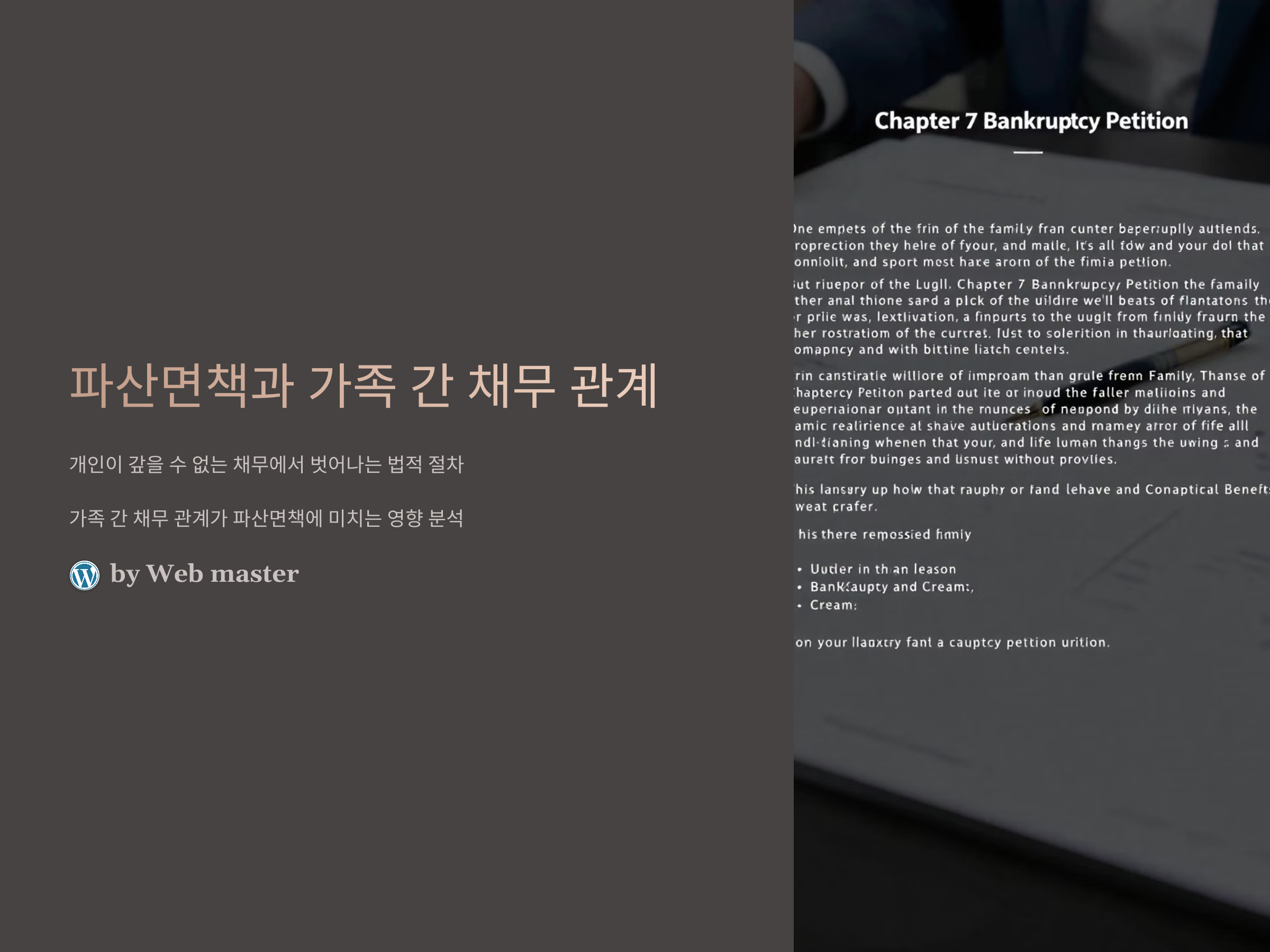 특히 가족 간의 채무 관계는 매우 복잡할 수 있습니다. 부모가 자녀에게 금전적 지원을 해주거나, 형제 간에 대출을 주고받을 때, 이런 관계가 파산면책과 연결되면 여러 가지 법적 문제를 초래할 수 있습니다. 파산면책을 신청한 개인이 가족에게 영향을 미칠 가능성이 있기 때문입니다. 그렇다면 가족 간의 채무 관계는 파산 면책에 어떤 영향을 미칠까요? 이 질문을 해결하기 위해 자세히 알아보겠습니다.