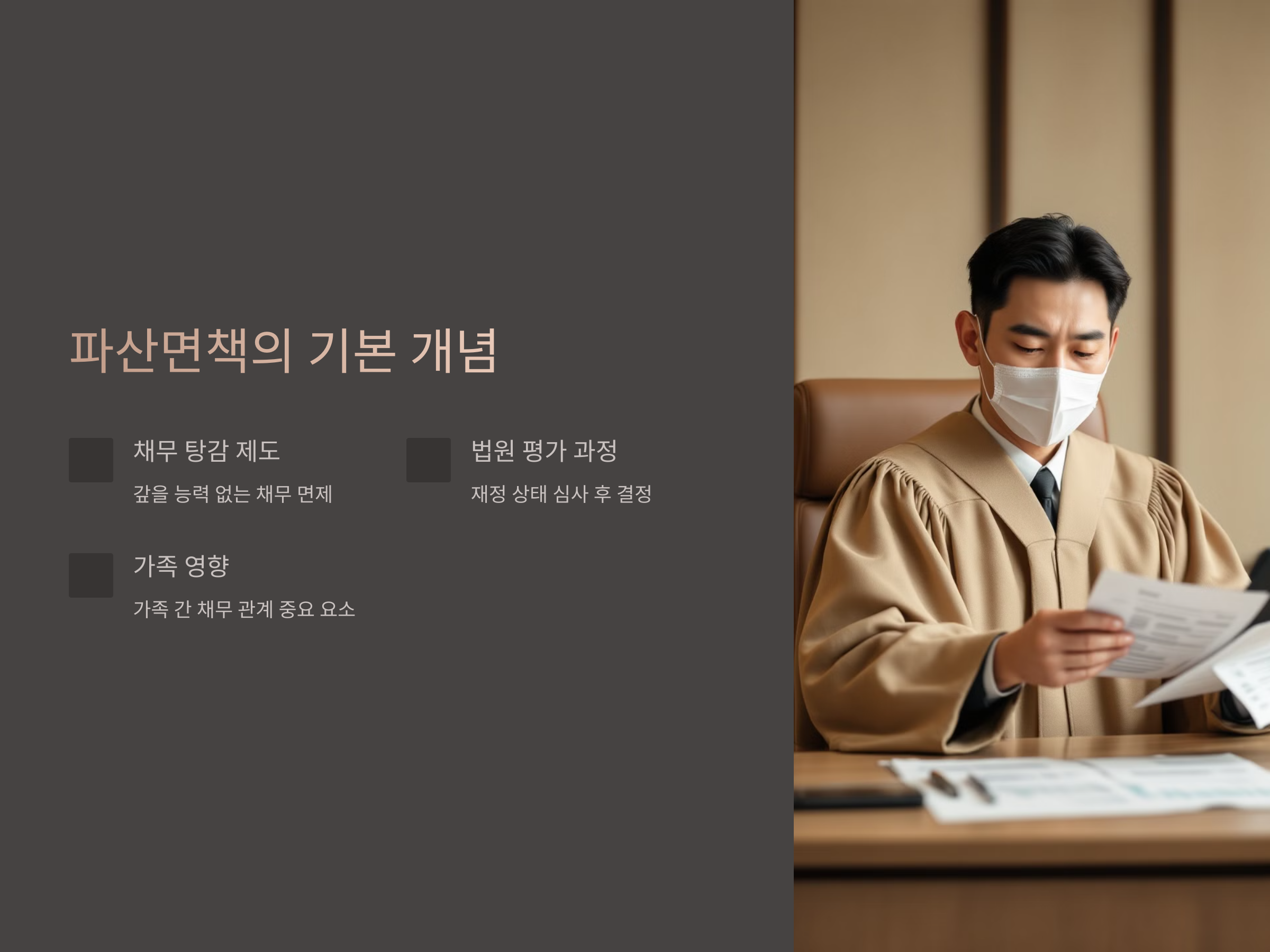 파산면책은 채무자가 더 이상 채무를 갚을 능력이 없다고 판단될 때, 법원이 채무자의 채무를 탕감해 주는 제도입니다. 일반적으로 개인이 파산을 신청하게 되면, 법원은 채무자의 재정 상태를 평가하여, 그가 갚을 수 없는 채무를 면책해주는 결정을 내리게 됩니다. 이 면책을 받으면 채무자는 법적으로 더 이상 채무를 갚지 않아도 되는 상태가 됩니다. 하지만 파산면책이 이루어진다고 해서 그 사람의 가족이 영향을 받지 않는 것은 아닙니다. 특히 가족 간의 채무 관계가 얽혀 있을 경우, 면책 절차에서 중요한 요소로 작용할 수 있습니다.