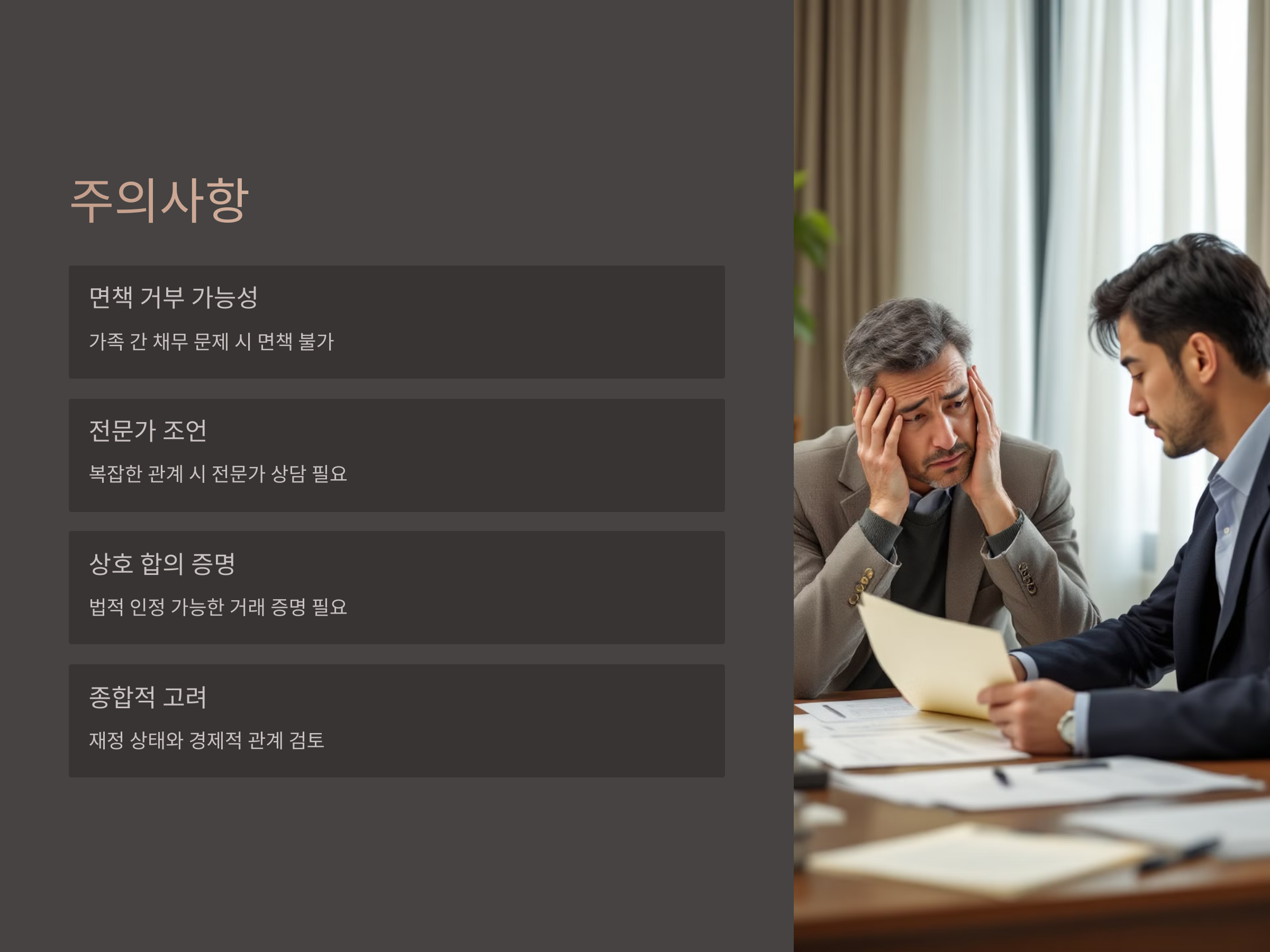 가족 간 채무 관계는 그 자체로 여러 가지 법적 문제를 야기할 수 있기 때문에, 파산면책을 고려할 때 주의가 필요합니다. 특히, 가족 간에 발생한 채무가 파산면책 절차에서 문제가 될 수 있는 경우, 채무자는 면책을 받지 못할 수도 있습니다. 따라서 가족 간의 채무 관계가 복잡하게 얽혀 있다면, 면책 절차에 영향을 미칠 수 있는 요소들을 미리 파악하고, 전문가의 조언을 받는 것이 중요합니다.