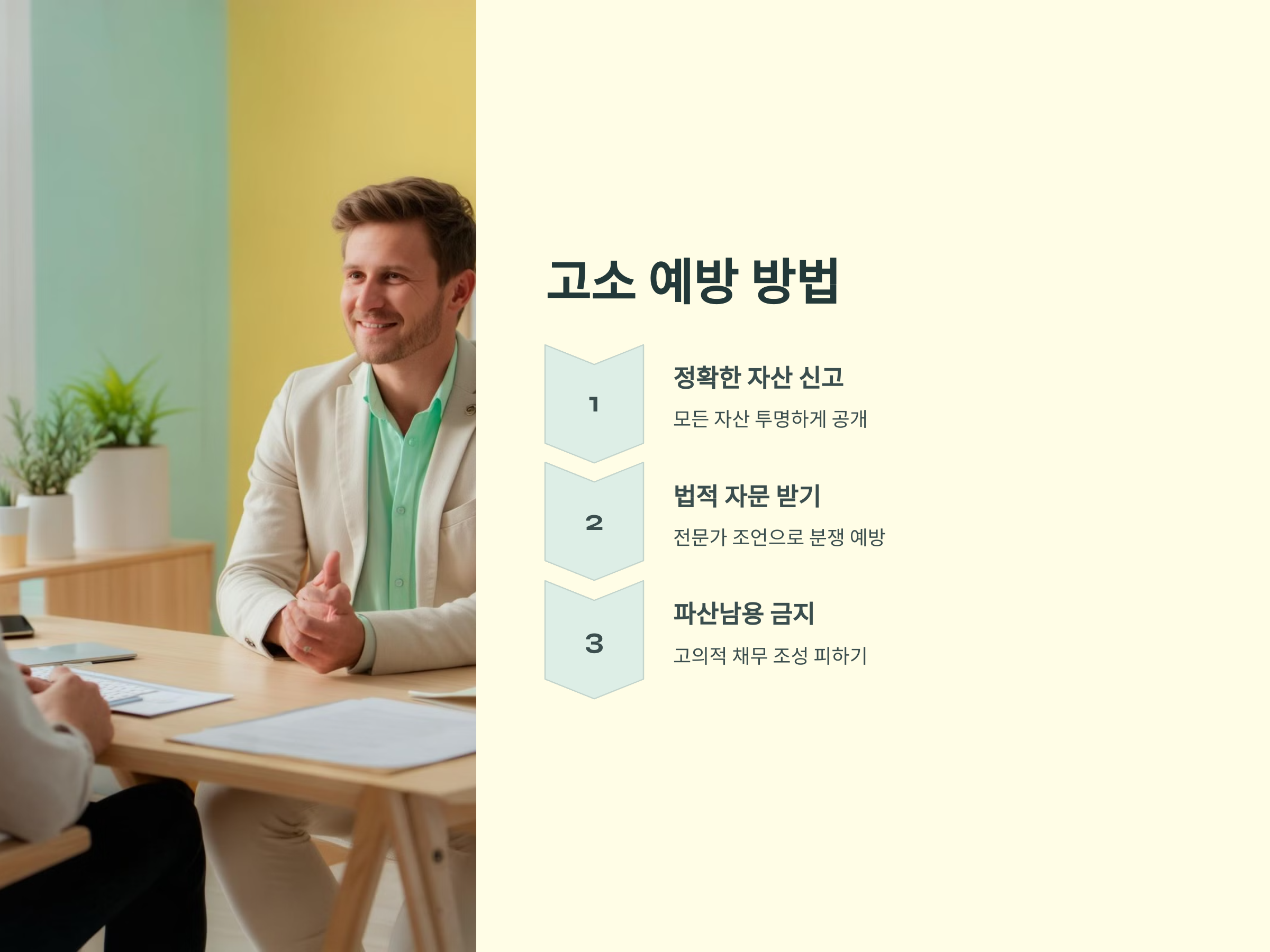 A: 네, 고의로 자산을 은닉하거나 불법적인 방법으로 채무를 증가시키면 고소를 당할 수 있습니다. 항상 투명하게 자산을 신고하고, 법적 절차를 준수해야 합니다.