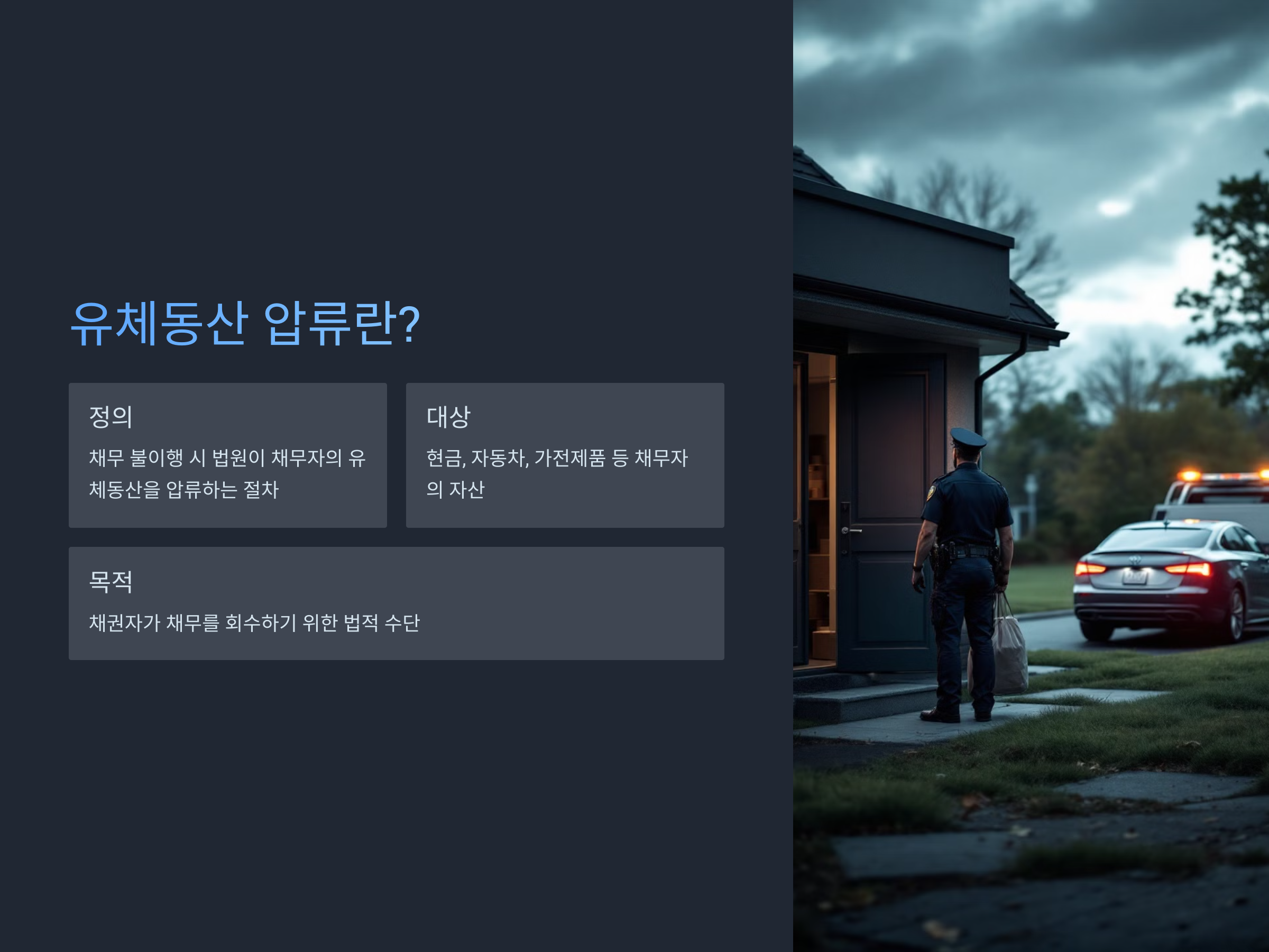 유체동산 압류는 채무자가 채무를 갚지 못했을 때, 법원이 채무자의 유체동산(현금, 자동차, 가전제품 등)과 같은 자산을 압류하여 처분하는 법적 절차입니다. 이는 채권자가 채무를 회수하기 위한 수단으로 사용됩니다. 유체동산 압류는 주로 채무자가 파산을 신청하거나, 채무불이행으로 인해 법적 조치를 받게 될 때 발생합니다.