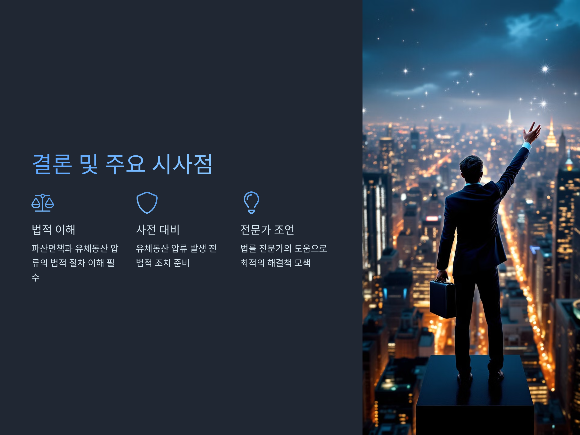 따라서, 파산면책을 신청하려면 반드시 전문가의 도움을 받아야 하며, 유체동산 압류가 발생하지 않도록 미리 법적 조치를 취하는 것이 중요합니다. 이러한 법적 절차들을 제대로 이해하고 준비하는 것이 채무자의 경제적 미래를 결정짓는 중요한 열쇠가 될 것입니다.