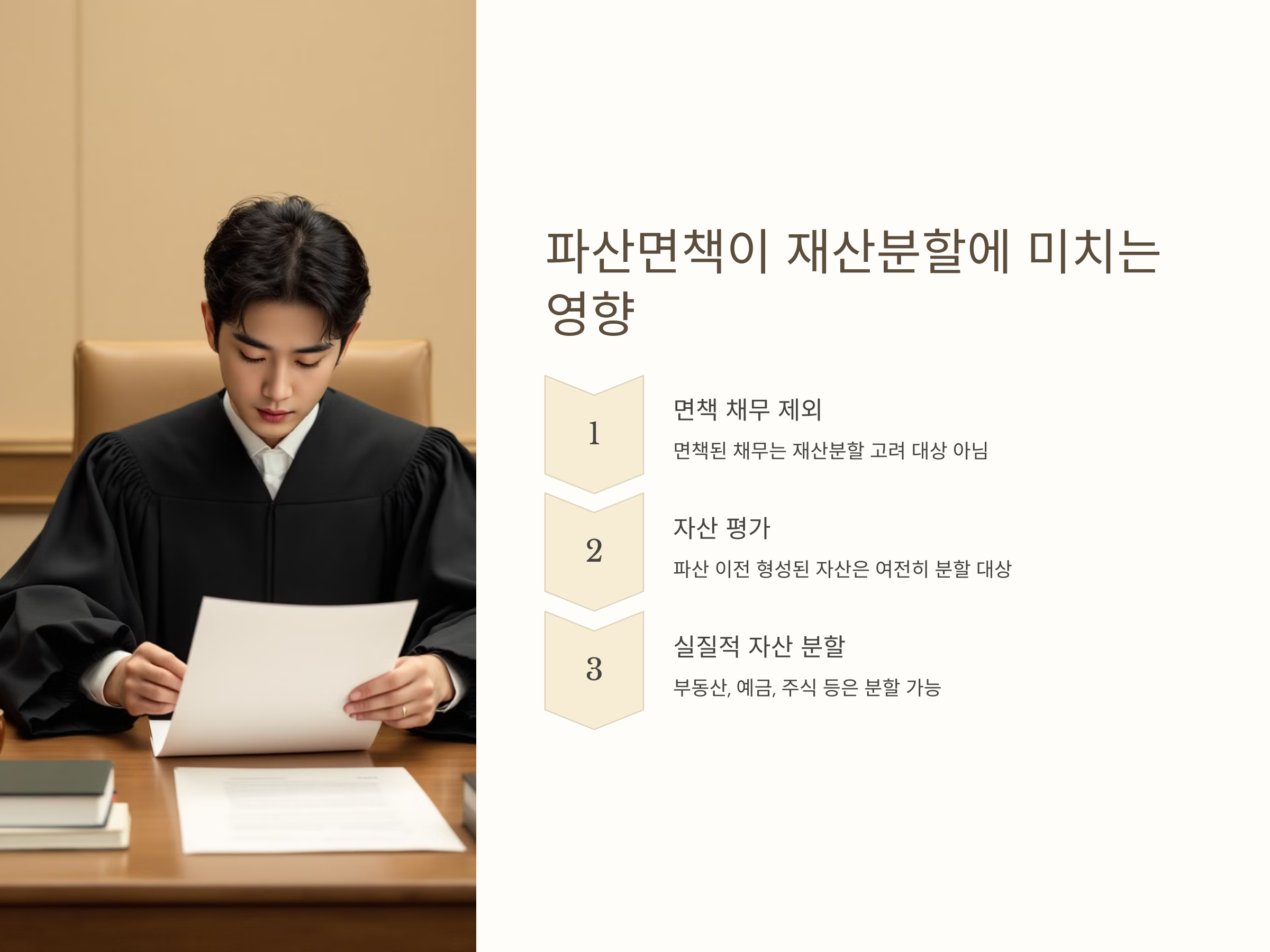 이 파산면책의 결정이 이혼에 미치는 영향은 상당히 중요한데, 왜냐하면 이혼 시 재산분할에서 파산으로 인한 채무가 어떻게 처리될지 결정하는 중요한 요소가 되기 때문입니다. 이 경우, 면책된 채무는 분할 대상에서 제외될 수 있으며, 파산 면책을 받은 배우자가 가진 자산의 분할에서 채무는 어떻게 처리될지 법원이 판단하게 됩니다.
