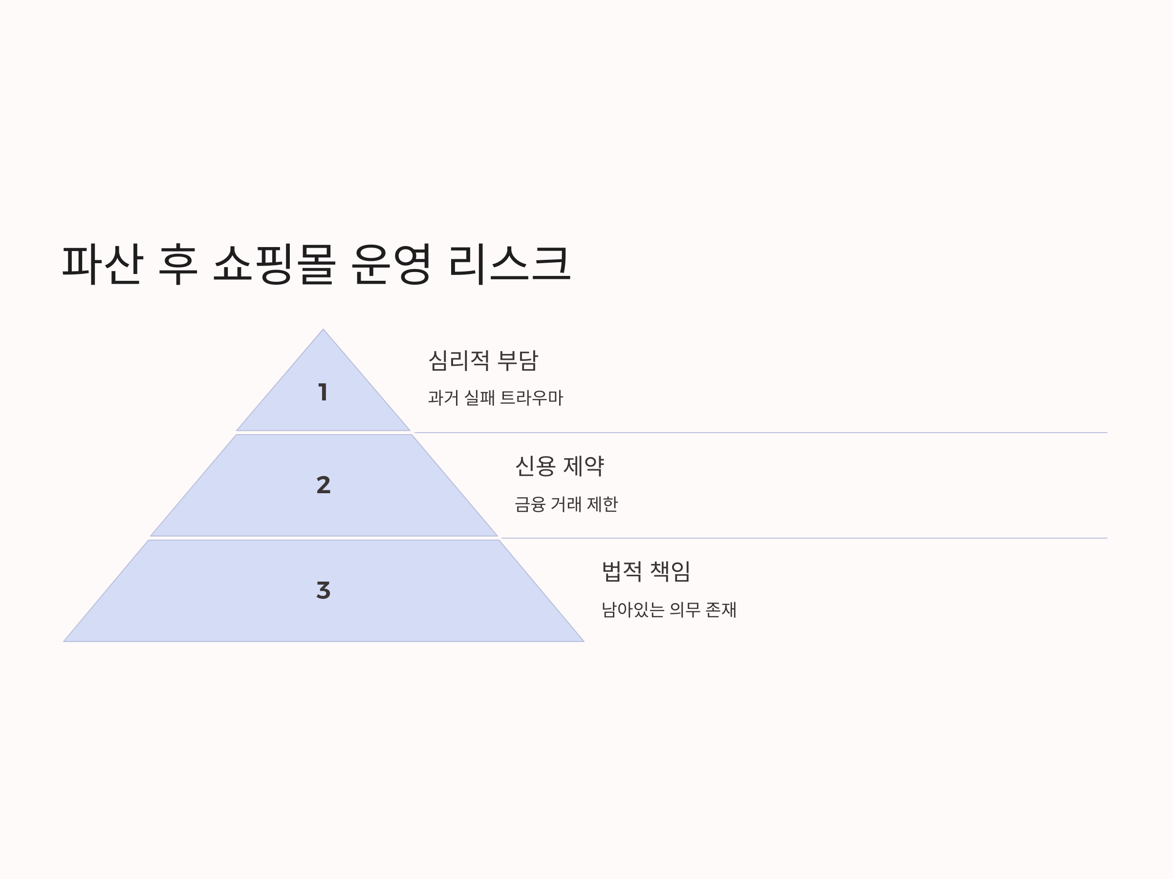 파산 후 쇼핑몰을 운영할 때는 여러 가지 리스크를 고려해야 합니다. 첫째, 법적 책임 문제입니다. 파산 면책을 받았더라도 특정 법적 책임이 여전히 남아 있을 수 있습니다. 예를 들어, 특정 계약에서 발생한 의무나 법적인 쟁점이 있을 수 있습니다. 또한, 파산 기록이 신용에 영향을 미칠 수 있기 때문에 금융 거래나 파트너십에서 제약이 생길 수 있습니다.
